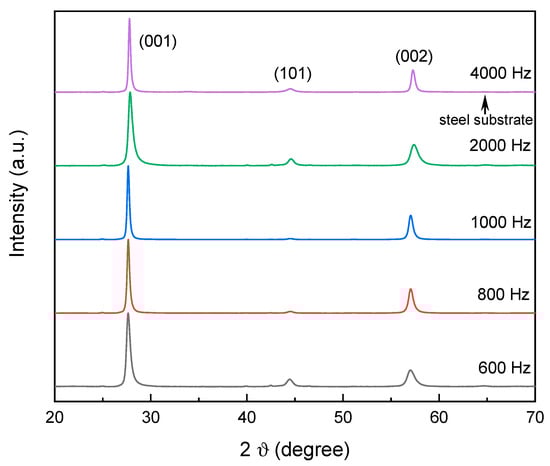 In the next stage, the samples of the TiB2 coating, composed of granules and crystals, was characterized via X-ray diffraction (XRD) to determine crystallographic orientation and grain size. The XRD patterns of coatings deposited on steel substrates at varying frequencies are presented in Figure 4.