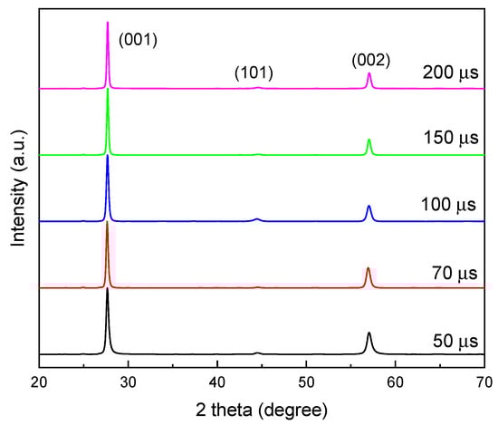 All observed peaks can be definitively assigned to the TiB2 phase, and a strong (001) crystallographic texture is clearly visible in all analyzed samples. No significant shift was observed in the position of the (001) peak as the pulse width was varied. Similarly, the values for the c-lattice parameter, which range from 3.220 Å at 200 µs to 3.223 Å at 50 µs, do not show a significant trend. The full width at half maximum (FWHM) of the TiB2 (001) diffraction peak ranges from 0.23° to 0.36°, and the calculated grain size for pulse widths from 50 to 200 µs is in the range of 23 to 35 nm (Table S2, Supplementary Materials).
