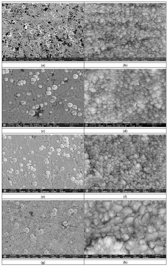 SEM image of the TiB2 coating surface deposited on steel at a constant frequency of 800 Hz and various pulse widths: (a,b) 70 µs; (c,d) 100 µs; (e,f) 150 µs and (g,h) 200 µs.