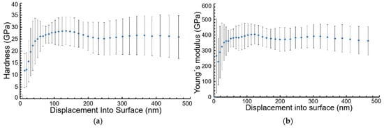 The hardness and Young’s modulus of the TiB2 coating deposited at a frequency of 2000 Hz and a pulse width of 50 µs are shown in Figure 8a,b, respectively.