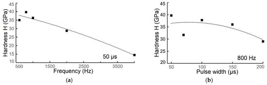 When the pulse width was held constant at 50 µs, the hardness of the coatings decreased from a maximum of 39.7 GPa (at 800 Hz) to a minimum of 14.5 GPa (at 4000 Hz); Figure 9a. A similar trend was observed when the frequency was held constant at 800 Hz and the pulse width was increased, with hardness decreasing from 39.7 GPa (at 50 µs) to 29 GPa (at 200 µs), Figure 9b. The observed maximum hardness value was higher than that reported by Zhang et al. (29 GPa at 300 °C, 50 V bias) but lower than their maximum of 44 GPa (at 200 °C, 50 V bias) []. The value is comparable to that of Nedfors et al. (45.5 GPa at 500 Hz, −60 V bias; 42 GPa at 1000 Hz, −60 V bias) []. Hardness increases with decreasing grain size (Tables S1 and S2—Supplementary Materials).