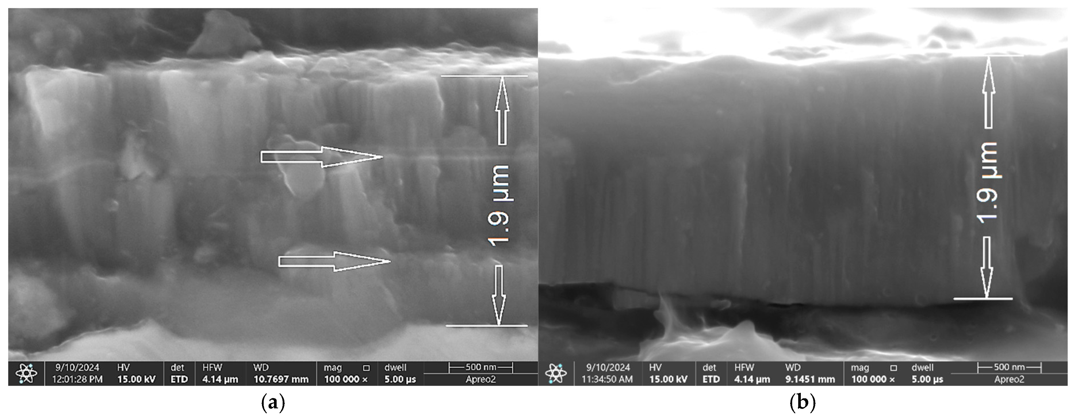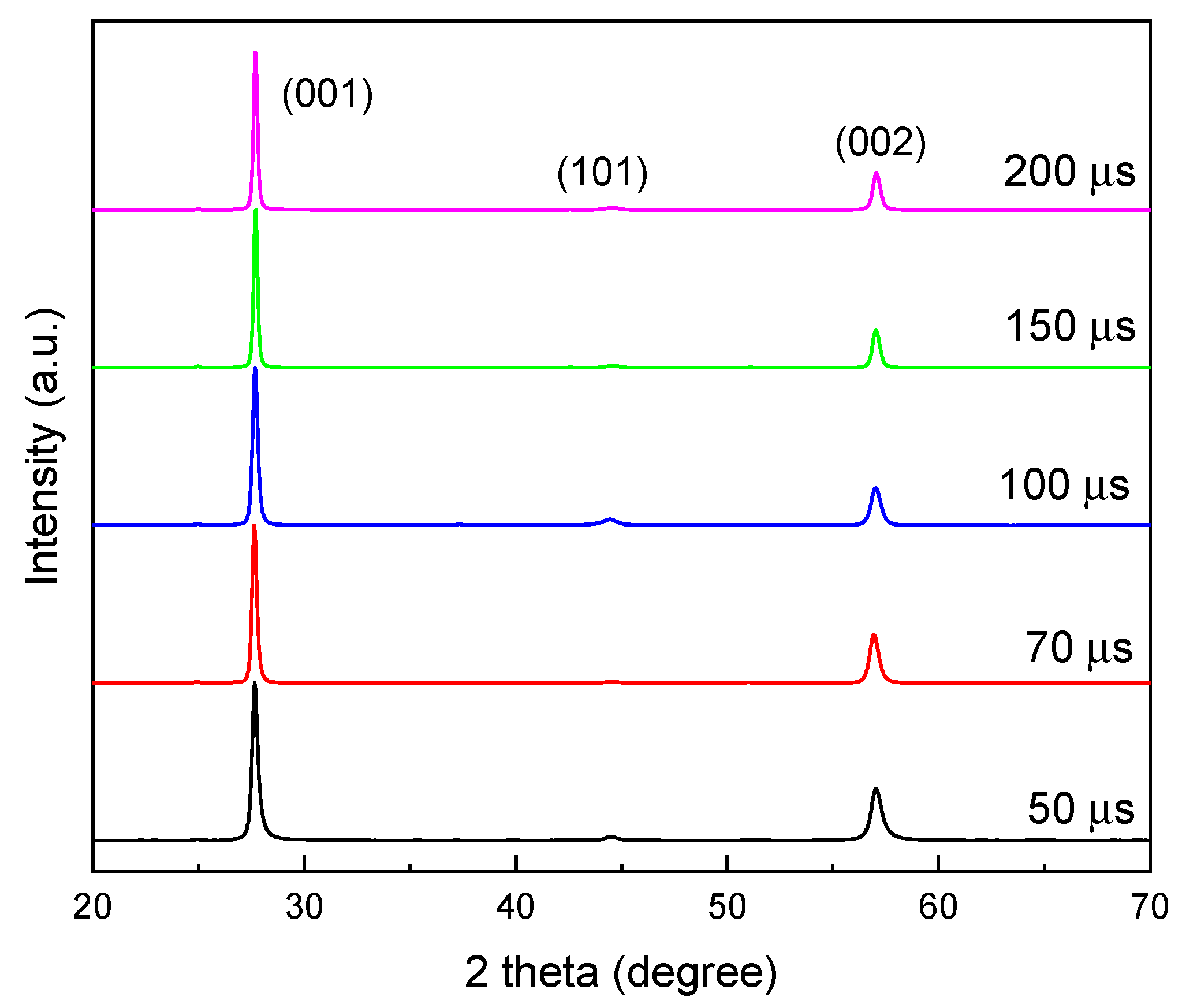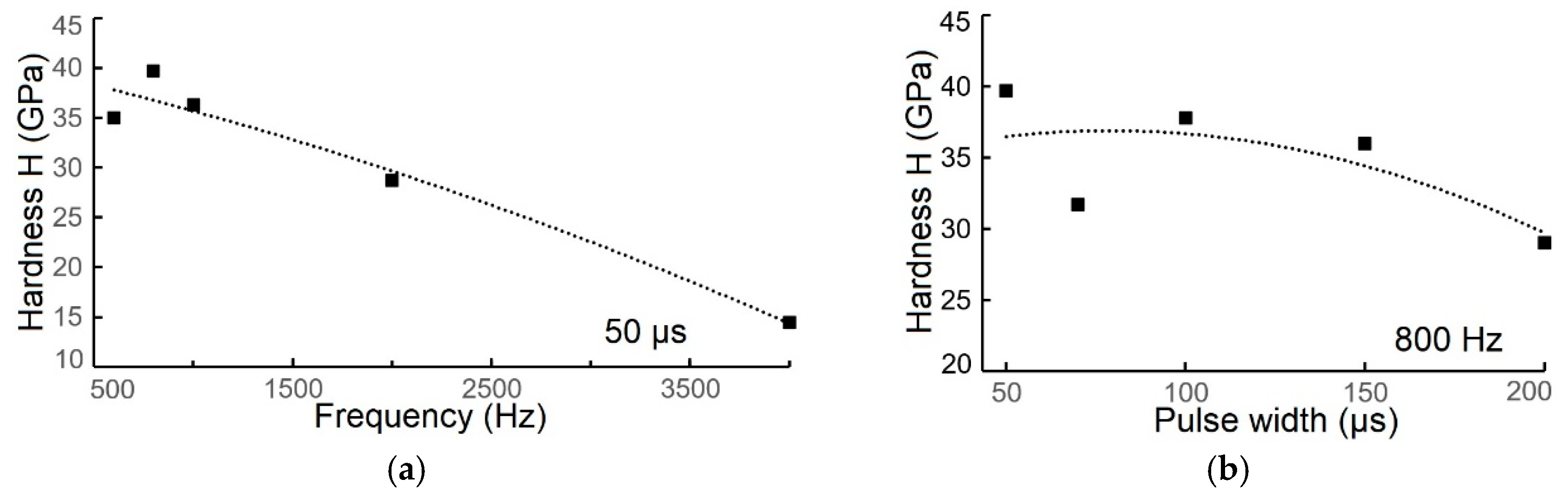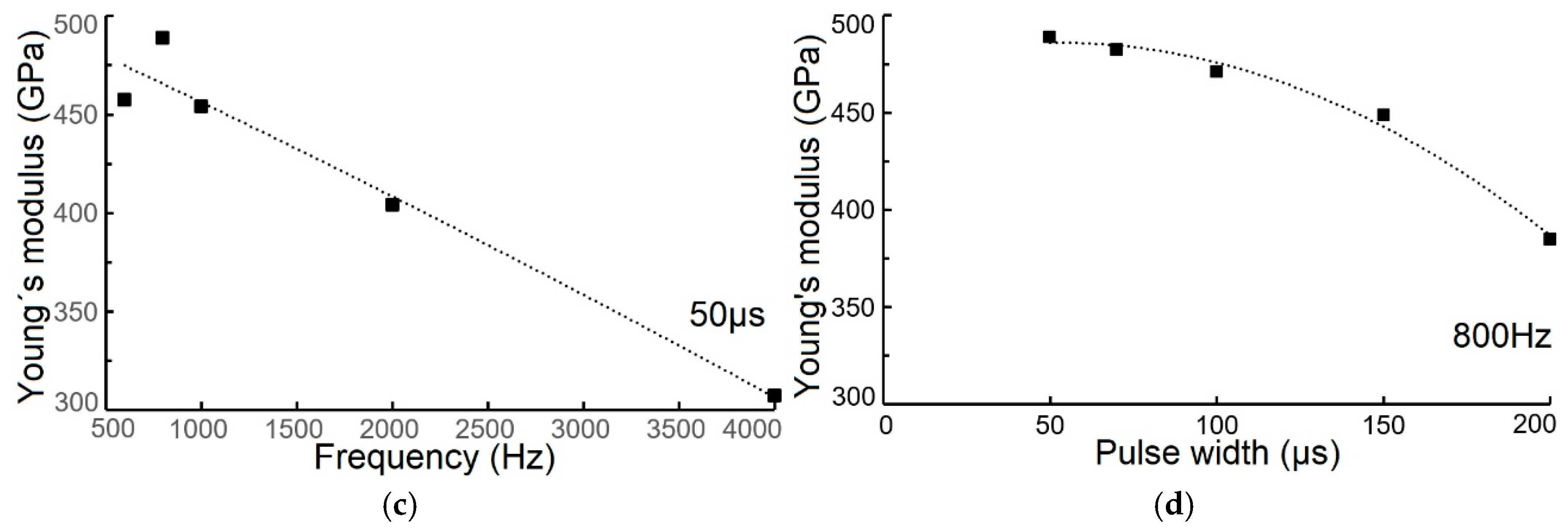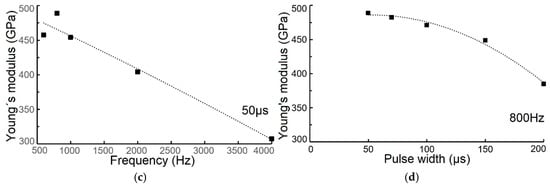 - Both hardness and Young’s modulus showed a decrease as frequency and pulse width increased. The hardness ranged from approximately 25 GPa to 21 GPa, while Young’s modulus decreased from 450 GPa to 380 GPa. This suggests a strong correlation with the obtained compositions and internal stress.