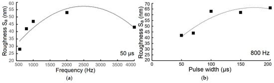 However, at 4000 Hz, the roughness decreased to 43 nm. The presence and characteristics of embedded microdroplets directly influence this roughness, as shown in Figure S2a,c,e,g,i (Supplementary Materials), with their density and size visible in the corresponding figures (Figure S2b,d,f,h,j, Supplementary Materials). As the pulse width was increased, the roughness also increased. At a constant frequency of 2000 Hz, the roughness rose from 42 nm to 66 nm (Figure 10b). Specifically, at 800 Hz, a 200 µs pulse width resulted in a roughness of 66 nm (Figure 7b). In both cases, the roughness was influenced by the integrated microdroplets in the coating (Figure S3a,c,e,g), with their density and size clearly visible in the Figure S3b,d,f,h (Supplementary Materials).