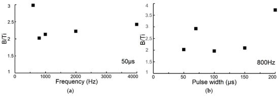 Dependence of the chemical composition (B/Ti) of TiB2 coating on (a) frequency and (b) pulse width.