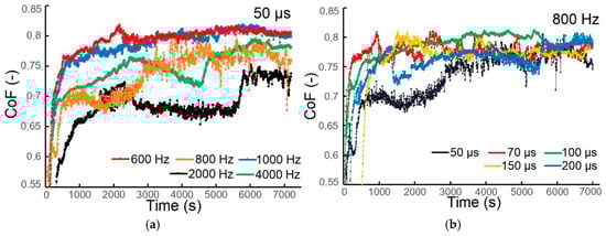 At a constant frequency of 800 Hz, the pulse width had a minimal effect on the CoF, with values consistently close to 0.75 (Figure 13b). The minimum value of CoF was 0.75 for the coating deposited at a pulse width of 50 µs. Firstly, the CoF value increased to 0.67, followed by a decrease and a slight increase to 0.68 until 4000 s. This value remained constant until the end of the measurement, after which it sharply increased up to 0.75.