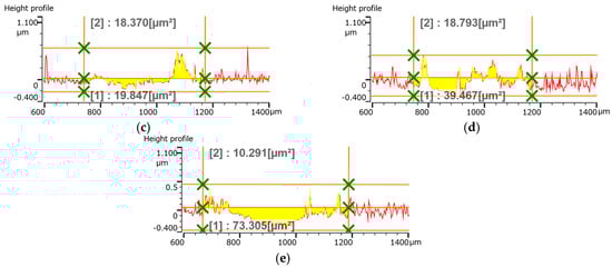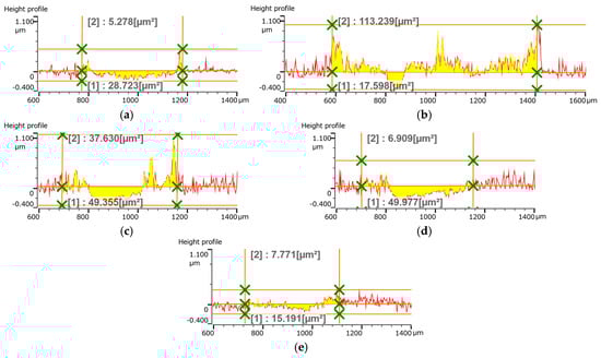 Cross-sectional area of the track after pin-on-disk test of TiB2 coatings deposited at a constant pulse width of 50 µs and frequency of (a) 600 Hz; (b) 800 Hz; (c) 1000 Hz; (d) 2000 Hz and (e) 4000 Hz.