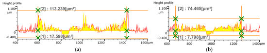 In the next stage, the wear was evaluated as the cross-sectional area of the wear track on the pin-on-disk test. Figure 13 and Figure 14 show that the wear track consists of material loss and material pushed to the sides of the path. The pushed-away material can be a combination of the TiB2 coating and the sphere’s material, though this was not specifically evaluated.