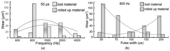 Figure 15a shows that the minimum material loss occurred at a frequency of 800 Hz, while the maximum loss was at 1000 Hz and 2000 Hz. The amount of pushed-away material showed a similar trend, with a minimum at 800 Hz and a maximum at 600 Hz.