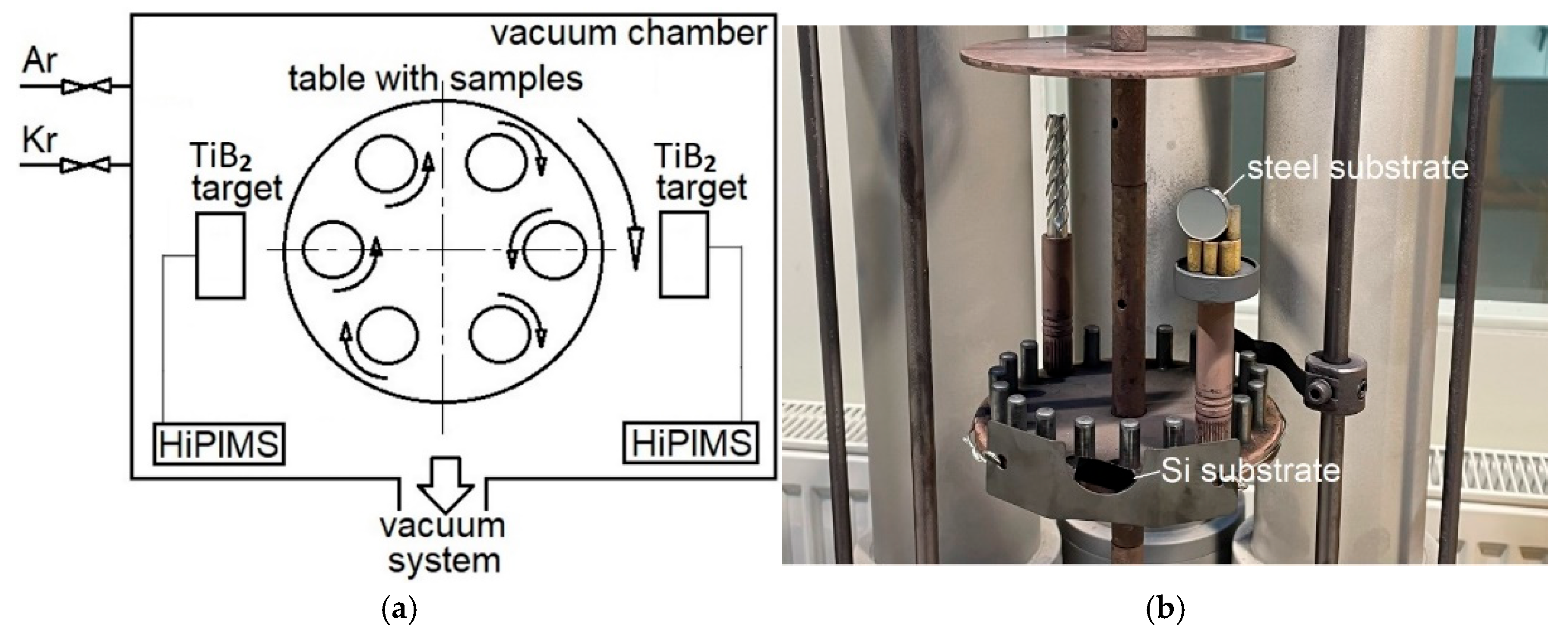 - Panich, N.; Sun, Y. Effect of substrate rotation on structure, hardness and adhesion of magnetron sputtered TiB2 coating on high speed steel. Thin Solid Films 2006, 500, 190–196. [Google Scholar] [CrossRef]