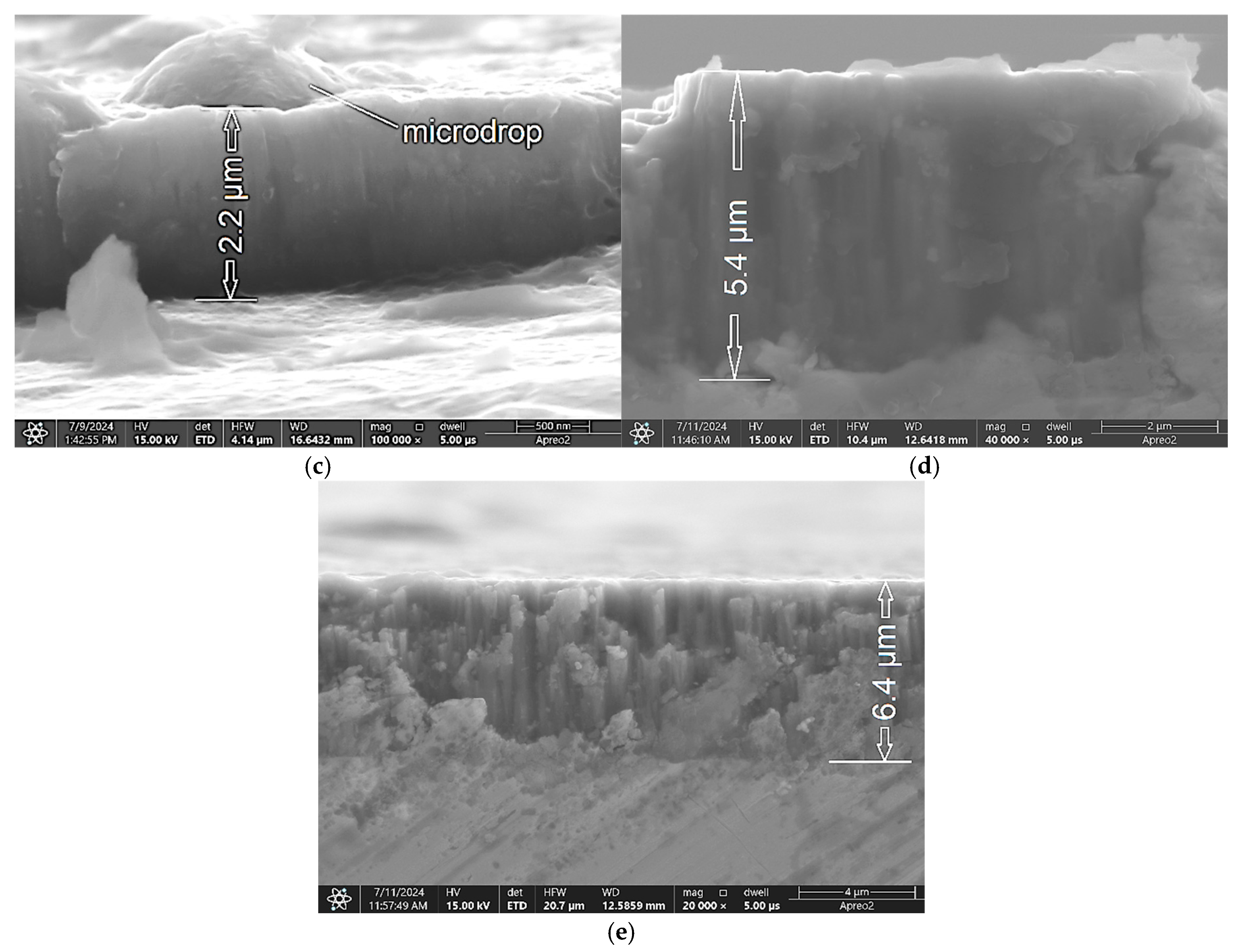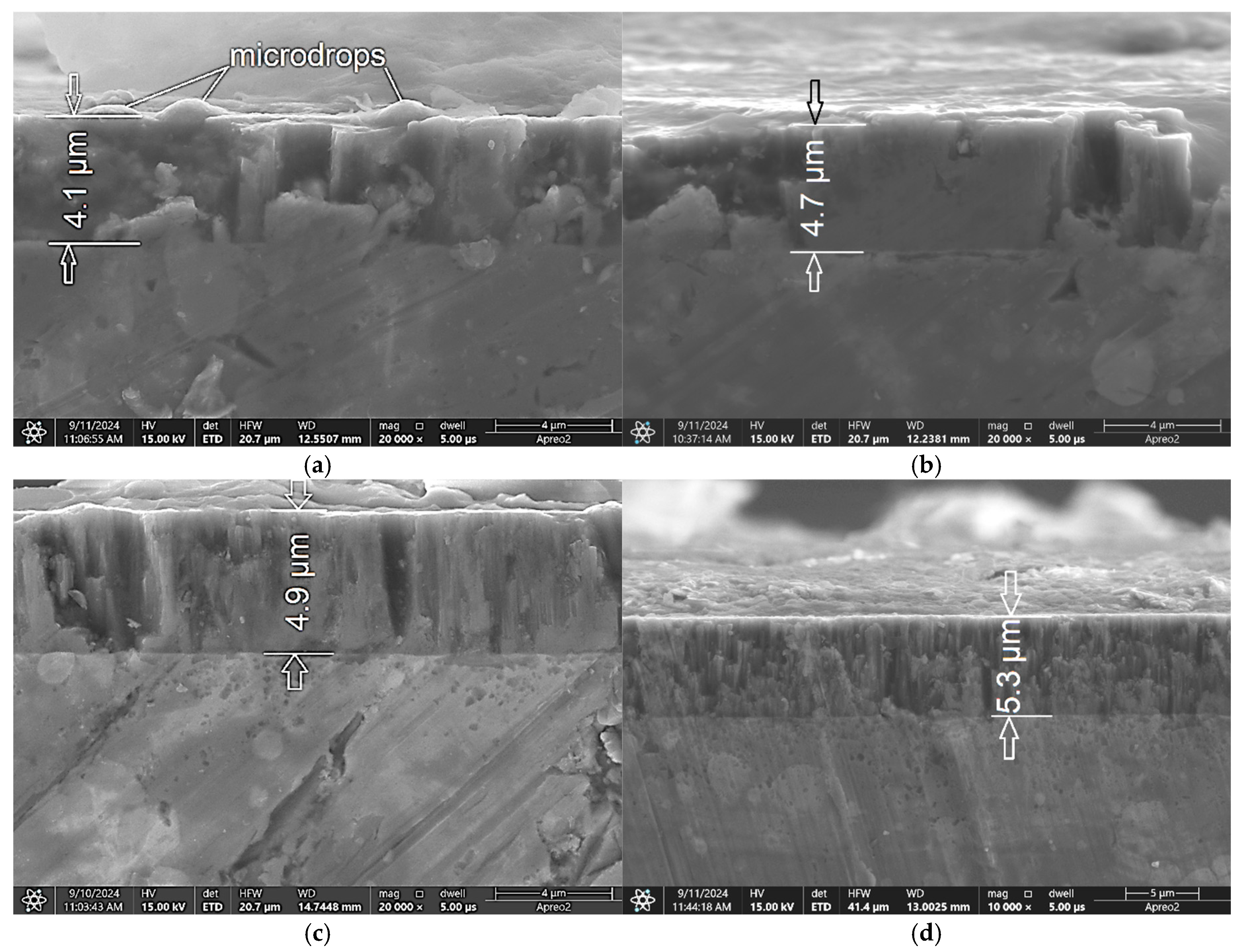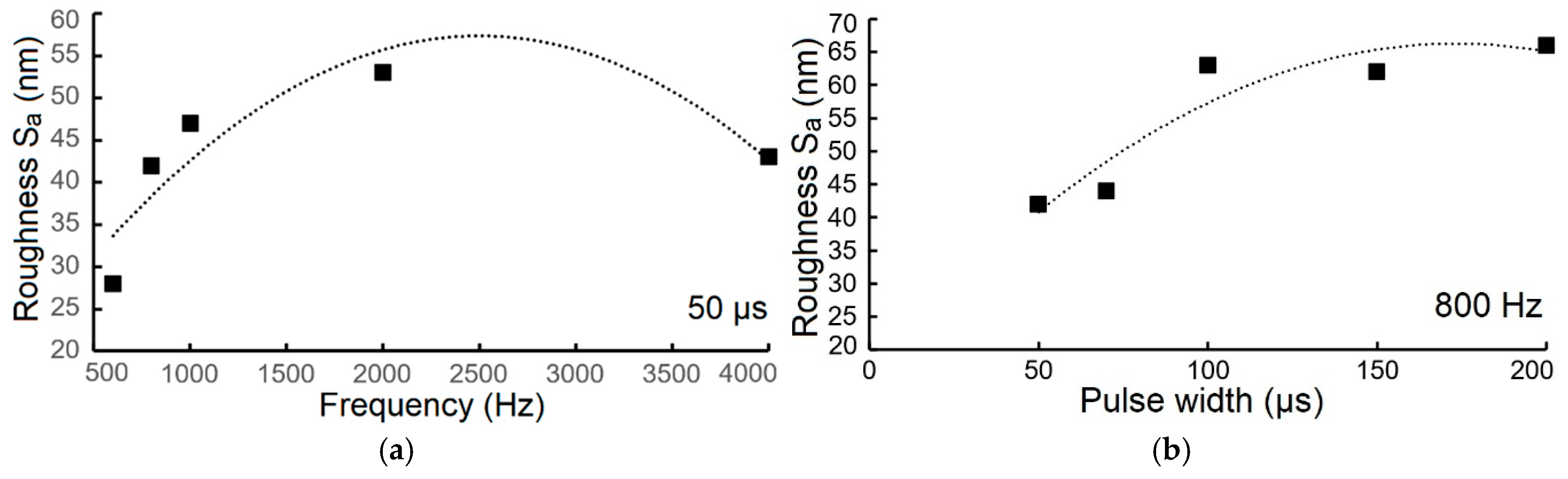 - The coating thickness and roughness (Sa) increased with increasing frequency and pulse width, confirming that these parameters directly influence the deposition rate and surface morphology.