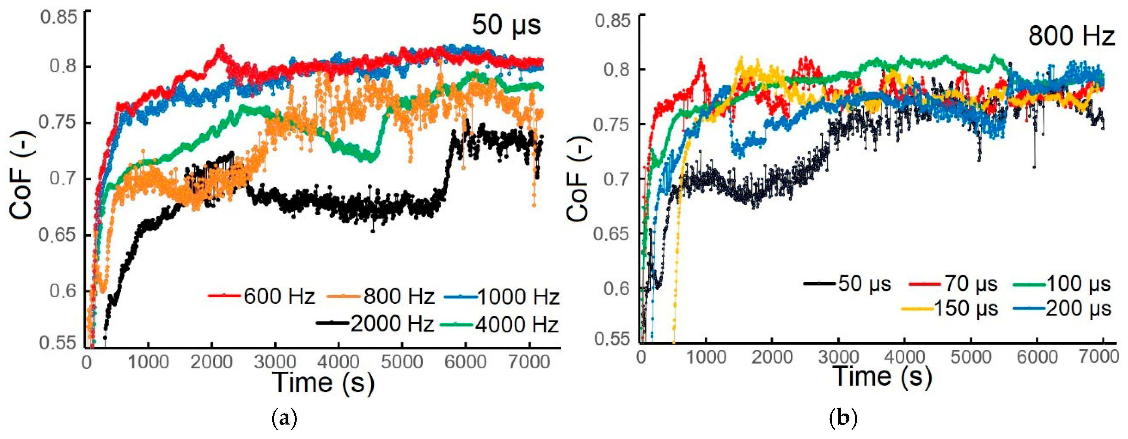 - All coatings demonstrated excellent adhesion, confirmed by Mercedes test ratings of HF1 to HF2. The coefficient of friction (CoF) showed a narrow range of 0.68 to 0.79, indicating stable tribological behavior. Wear, however, decreased with increasing frequency and increased with increasing pulse width, a behavior linked to the balance between hardness and surface roughness.