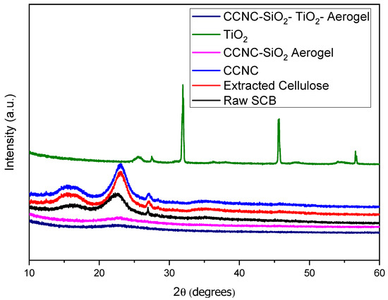 XRD spectra of raw SCB, extracted cellulose, carboxylated cellulose, carboxylated CNC-silica aerogel, TiO2, and carboxylated CNC-silica-TiO2 aerogel hybridized composite material.