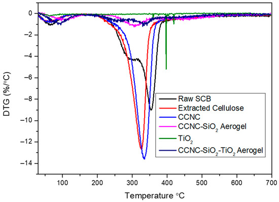 DTG spectra of raw SCB, extracted cellulose, carboxylated cellulose, carboxylated CNC-silica aerogel, TiO2, and carboxylated CNC-silica-TiO2 aerogel hybridized composite material.