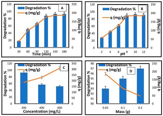 Batch photocatalytic degradation experiments of methylene blue (MB) were performed to evaluate the photodegradation process. A specific amount of photocatalyst (between 0.05 and 0.2 g) was added to 50 mL of MB dye solution, with initial concentrations ranging from 200 to 600 mg/L and exposed to UV light (a low-pressure mercury vapour lamp with a primary emission wavelength of 254 nm). The pH of the solution was adjusted from 2 to 12 using 0.1 M HCl or NaOH. The experiments were conducted at a constant temperature of 301 K with continuous stirring. At predetermined intervals (30, 60, 90, 120, 150, 180, 210, and 240 min), the remaining MB dye concentration was measured at 665 nm using a Pharo 300 Spectroquant UV-Vis spectrophotometer (Merck, Johannesburg, South Africa). Notably, the first 30 min occurred in darkness. For the parameter optimization studies (effects of pH, initial concentration, and catalyst dose), the total irradiation time was 150 min, unless otherwise stated. The degradation percentage (D%) and degradation concentration (qt) were calculated using the following equations:
