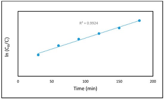 The kinetics of the photocatalytic degradation process offer valuable insights into the mechanism underlying the removal of MB dye using the carboxylate cellulose nanocrystal-silica-titanium dioxide (CCNC-silica-TiO2) hybrid aerogel. To analyze the photodegradation behaviour, the pseudo-first-order kinetic model was applied, based on the Langmuir–Hinshelwood mechanism at low contaminant concentrations. This model assumes that the degradation rate is directly proportional to the concentration of the contaminant (in this case, MB dye). The process is described by the following equation: