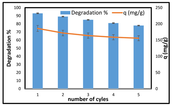 The economic importance of a stable and easily regenerable adsorbent is crucial, making reusability a vital consideration. In light of this, the CCNC-silica-TiO2 aerogel was tested across multiple photocatalysis cycles. As illustrated in Figure 9, the degradation capacity remained above 70%, with a peak degradation concentration of 148 mg/g after five consecutive cycles. This demonstrates the excellent stability and remarkable reusability of the synthesized CCNC-silica-TiO2 aerogel.
