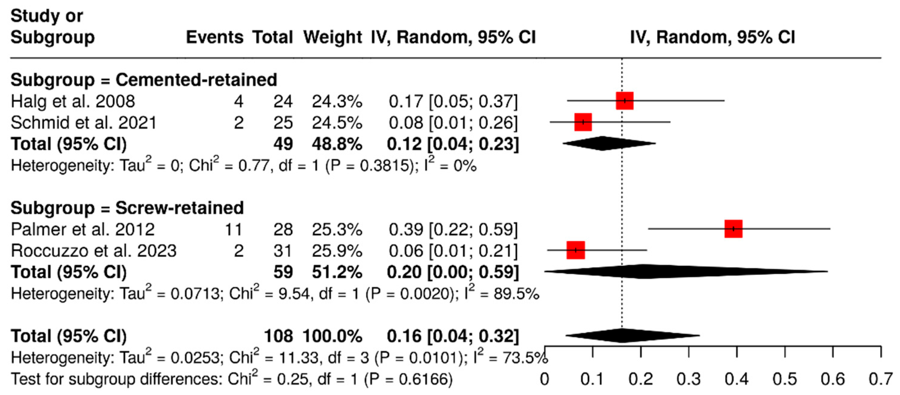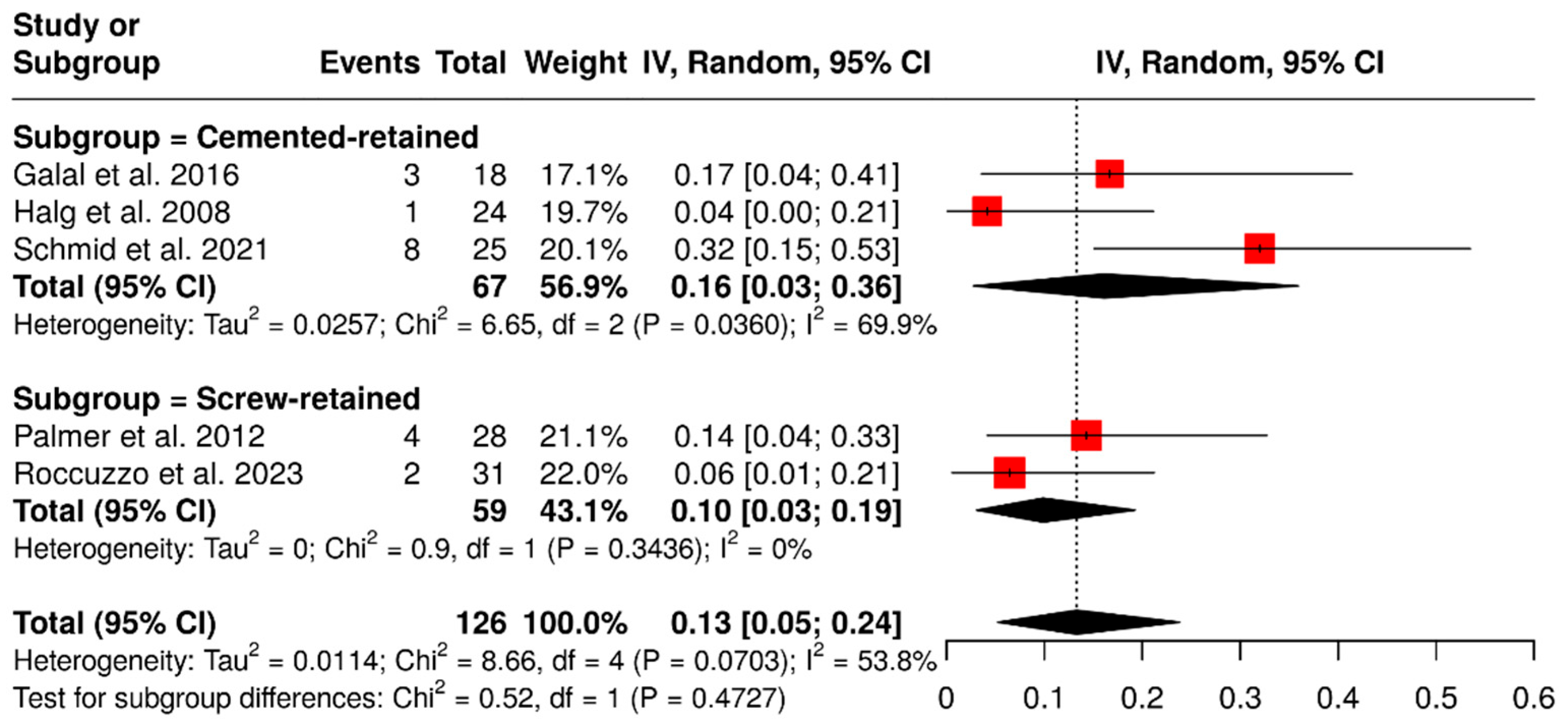 Retention rates comparing screw-retained and cement-retained prostheses | 5 | 147 | ⨁◯◯◯ Very low | a, b, c, e |