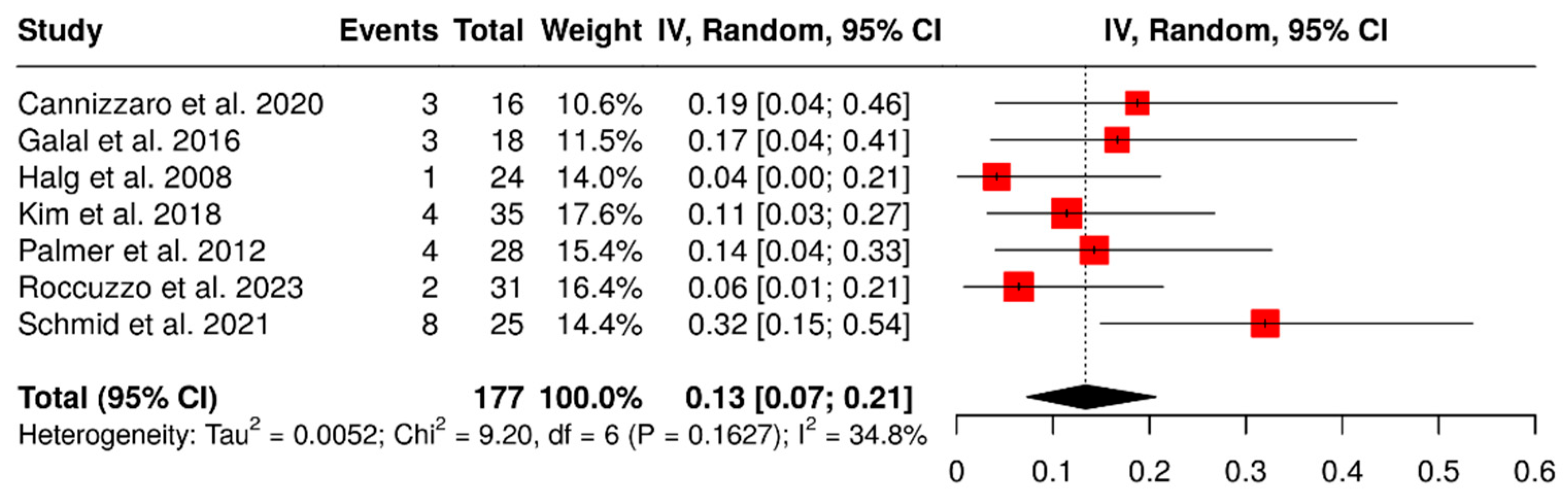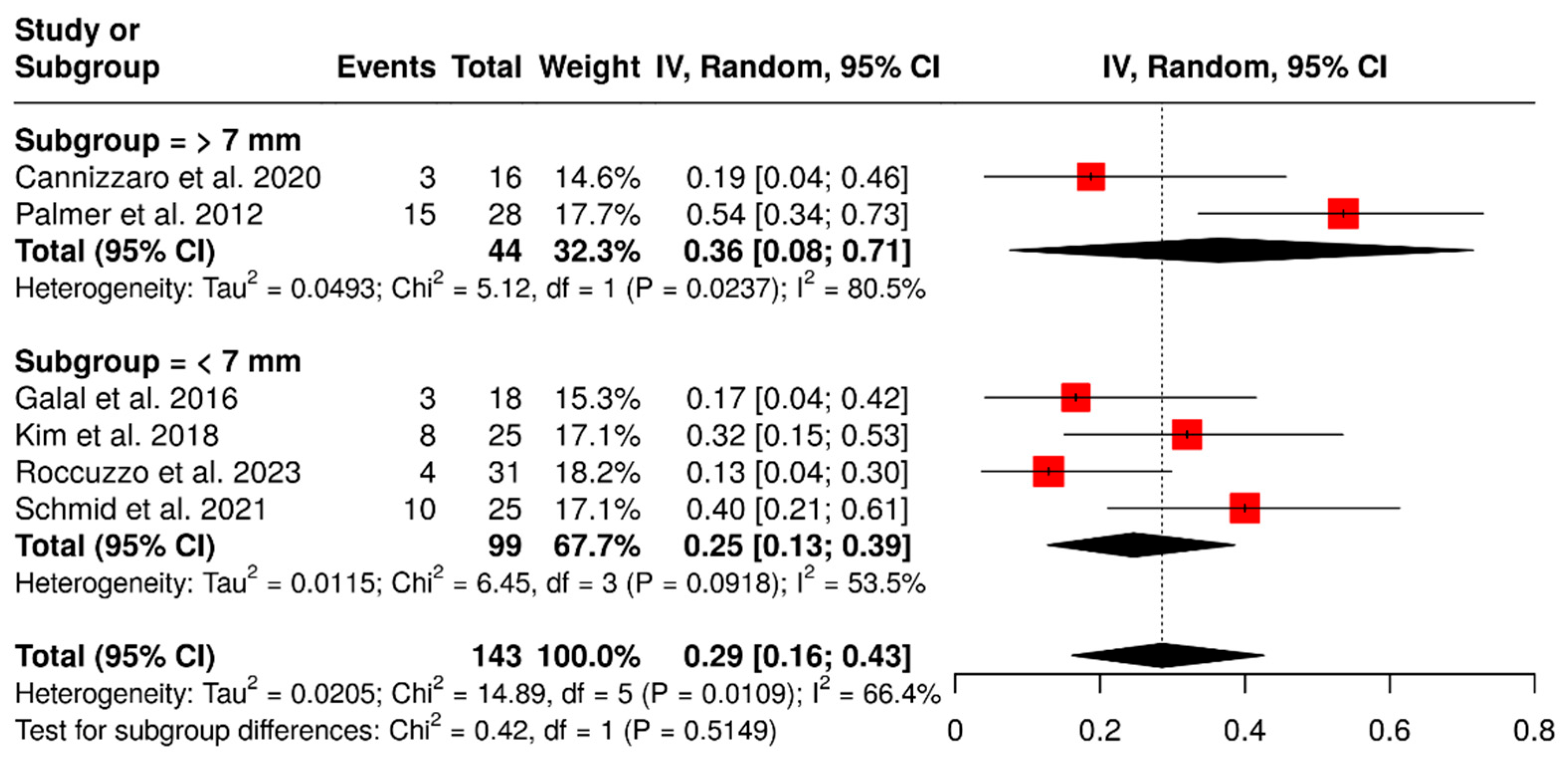Kim et al. 2018 [26] | Retros. (III-3) | 47.72 | 57.8 (26–71) | 33 | 35 | 7–13 × 4.3–7 Ø | 17/18 | 35/35 | Nr | 3.01–5.99 | 33/2 | NR | 100% | 7/3 Frac. 1 prot. and 1 impl. lost |