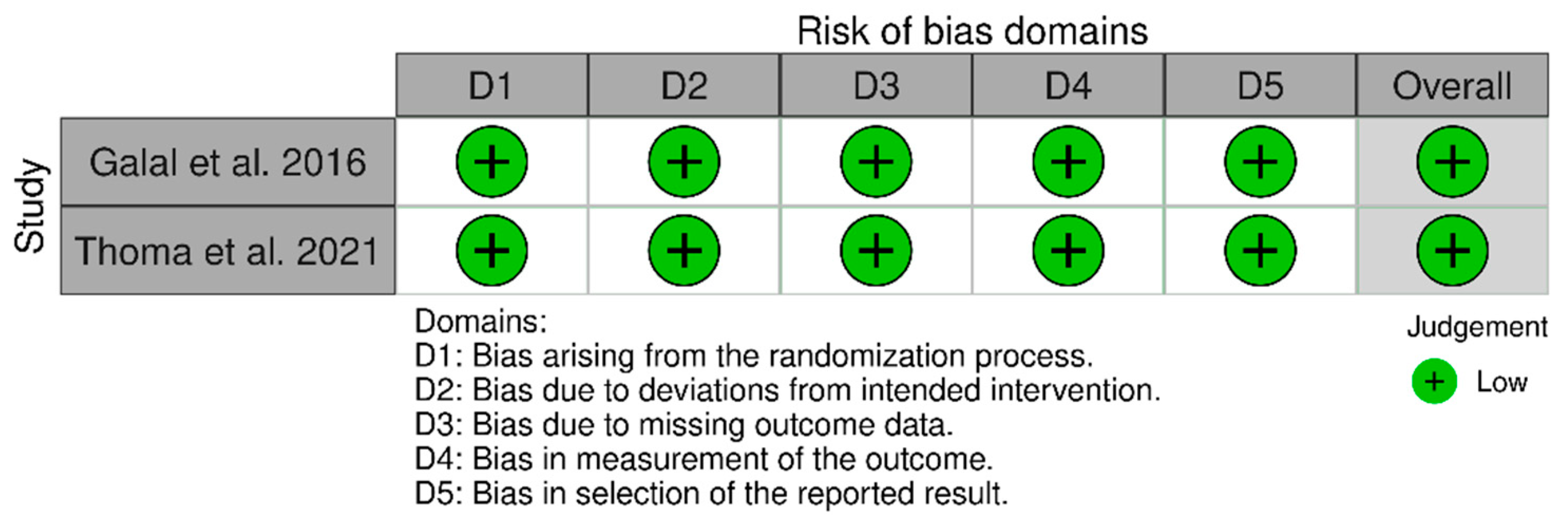- Sterne, J.A.C.; Savovic, J.; Page, M.J.; Elbers, R.G.; Blencowe, N.S.; Boutron, I.; Cates, C.J.; Cheng, H.-Y.; Corbett, M.S.; Eldridge, S.M.; et al. RoB 2: A revised tool for assessing risk of bias in randomized trials. BMJ 2019, 28, 366. [Google Scholar] [CrossRef] [PubMed]