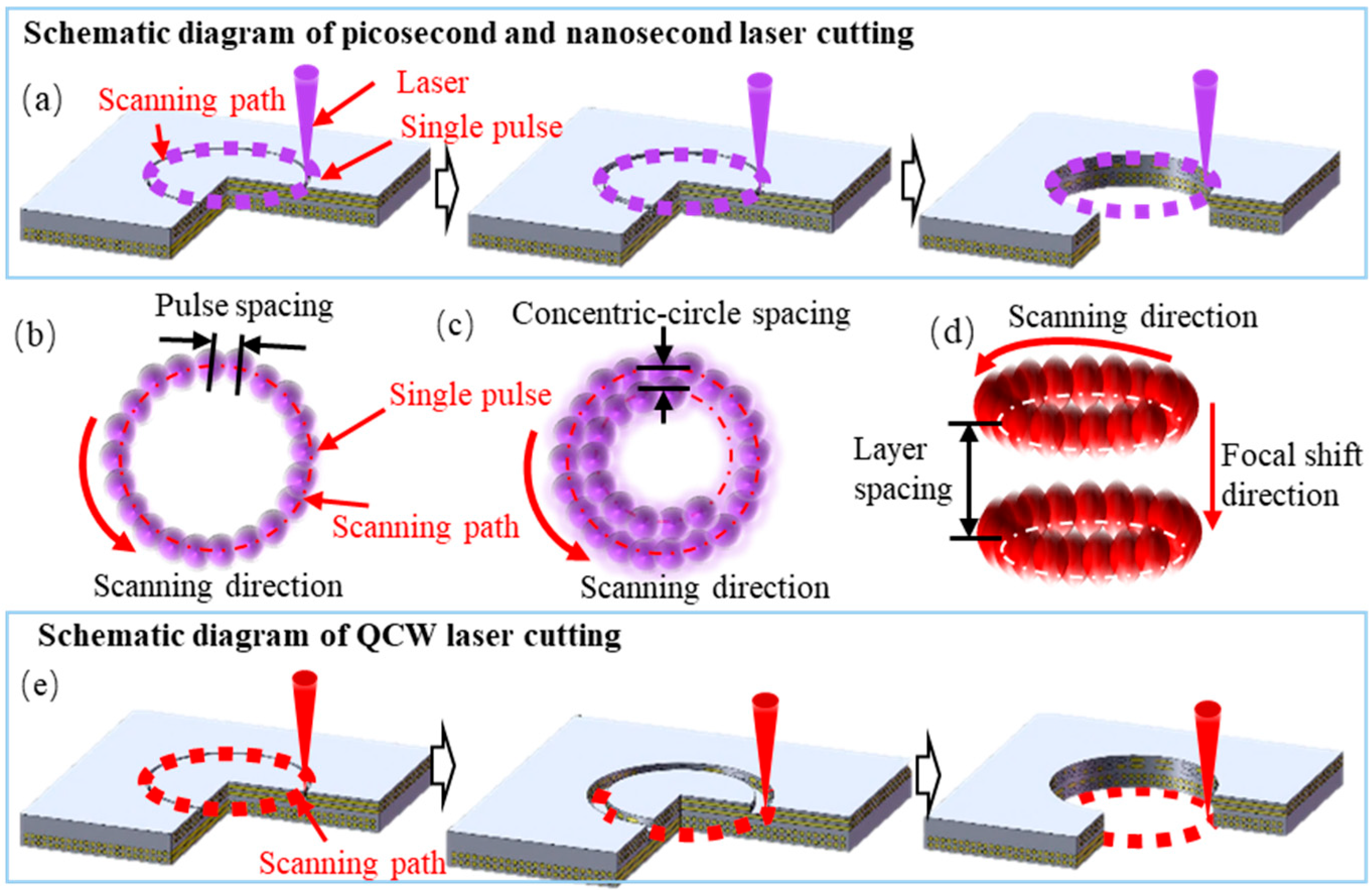 - Zhou, L.; Zhou, J.; Huang, P.; Zhang, G.; Lin, Z.; Zhao, Z.; Huang, Y.; Jiao, H.; Long, Y. Study on the mechanism of quasi-continuous wave (QCW) fiber laser low-damage processing of carbon fiber-reinforced plastics. Int. J. Adv. Manuf. Technol. 2023, 124, 429–447. [Google Scholar] [CrossRef]