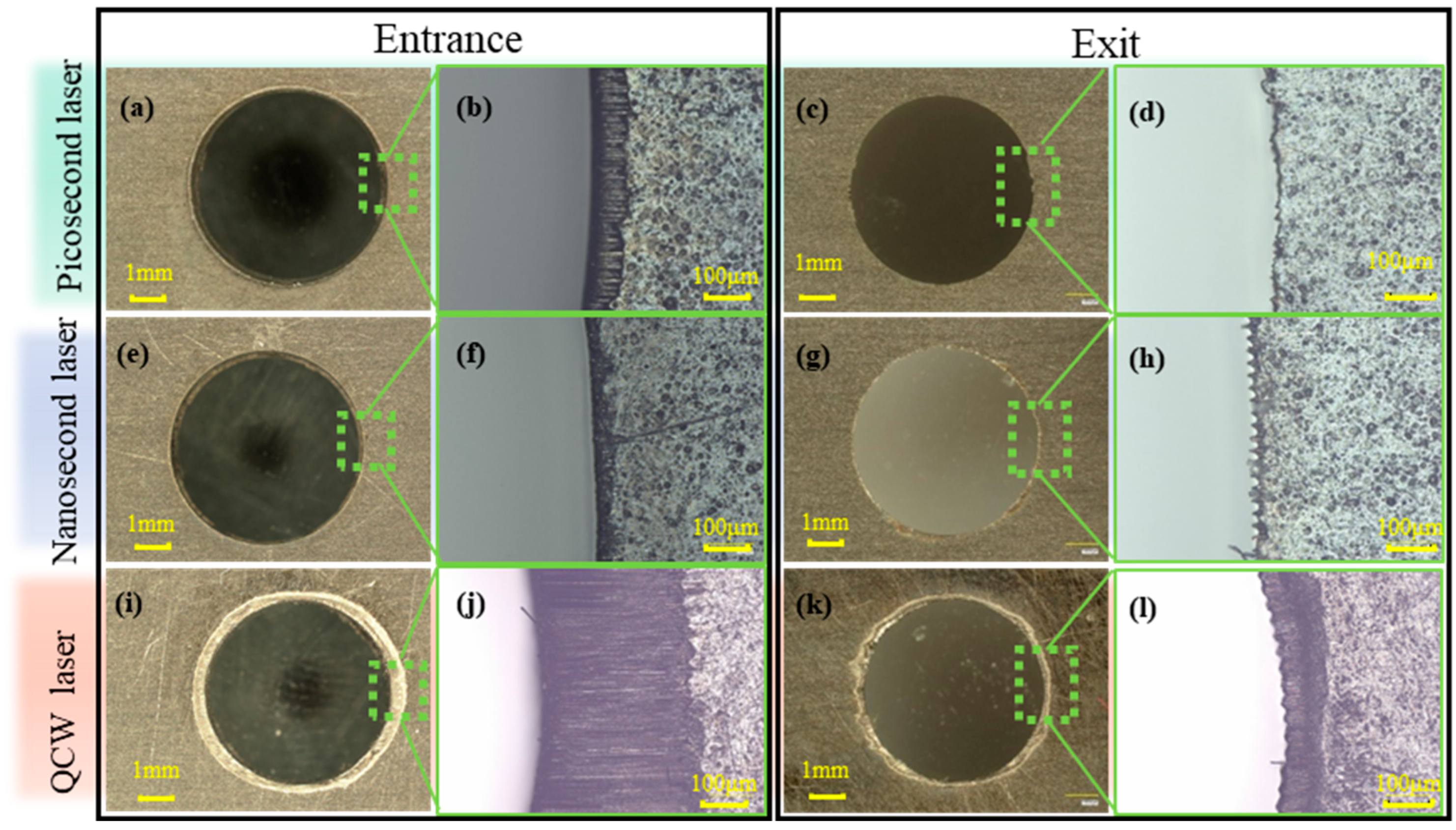 - Cutting efficiency exhibits an inverse scaling with pulse width. Owing to the six-order-of-magnitude span (10 ps–0.1 ms), single-hole processing time decreases from 480.4 s (picosecond-laser cutting) to 76.8 s (nanosecond-laser cutting) and 4.028 s (QCW-laser cutting), reflecting a transition from thermally driven ablation to mechanical spallation.
