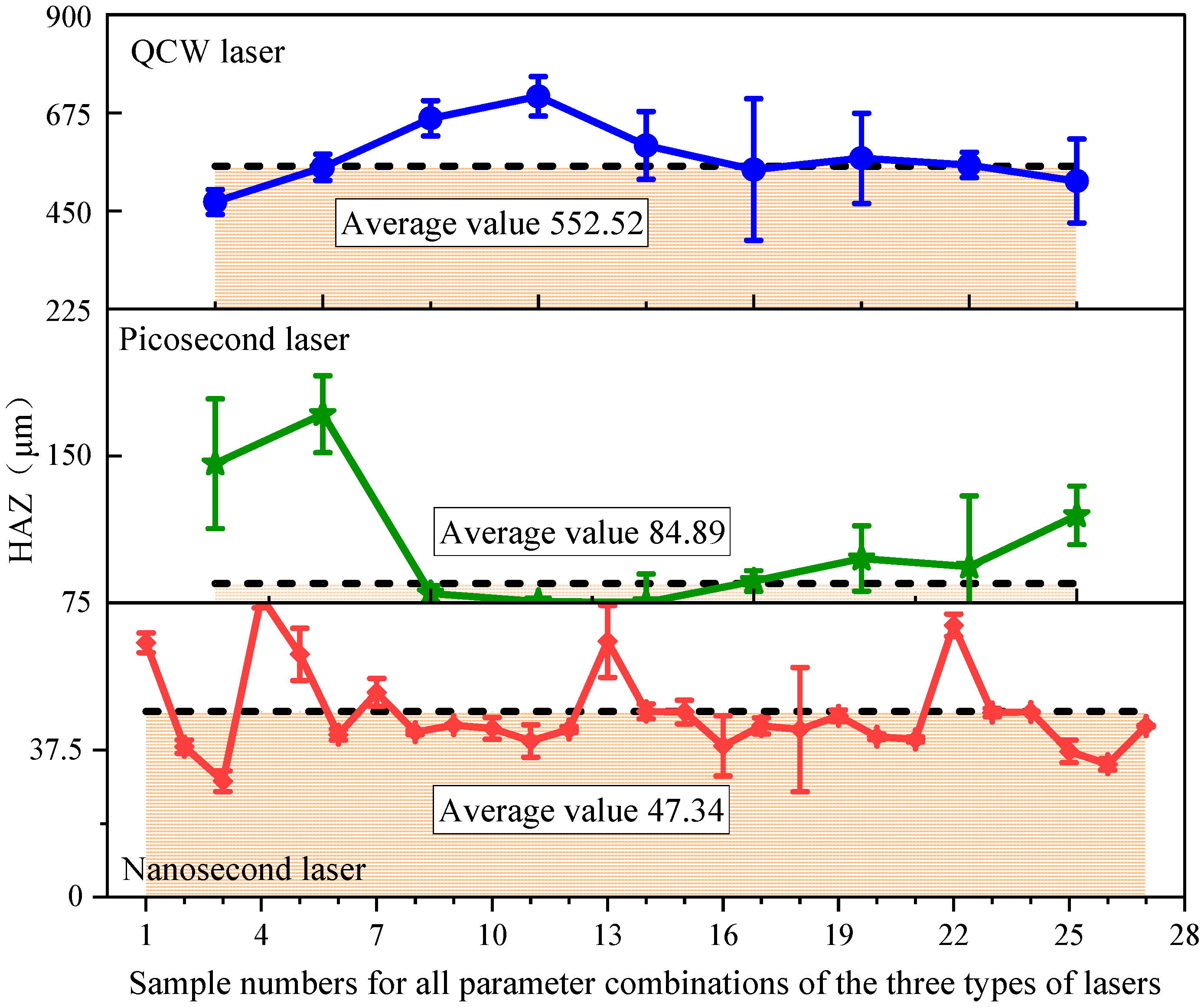 - The laser pulse duration decisively governs the material removal mechanism. Nanosecond pulses, with their moderate energy and duration, deliver the smallest HAZ among the three regimes; picosecond pulses, although ultrashort, suffer from limited average power and residual heat accumulation; and the QCW laser, dominated by sustained heat conduction, generates the largest HAZ (more than 11.6 times that of nanosecond pulses) and pronounced porosity.