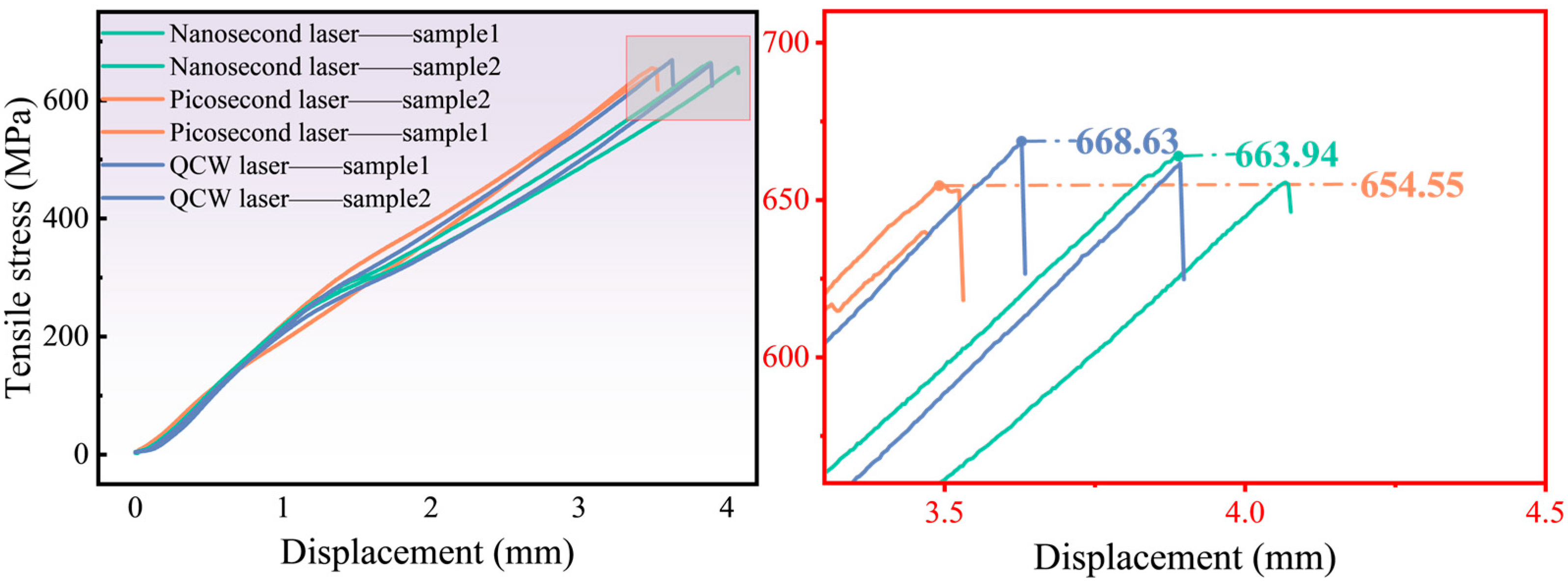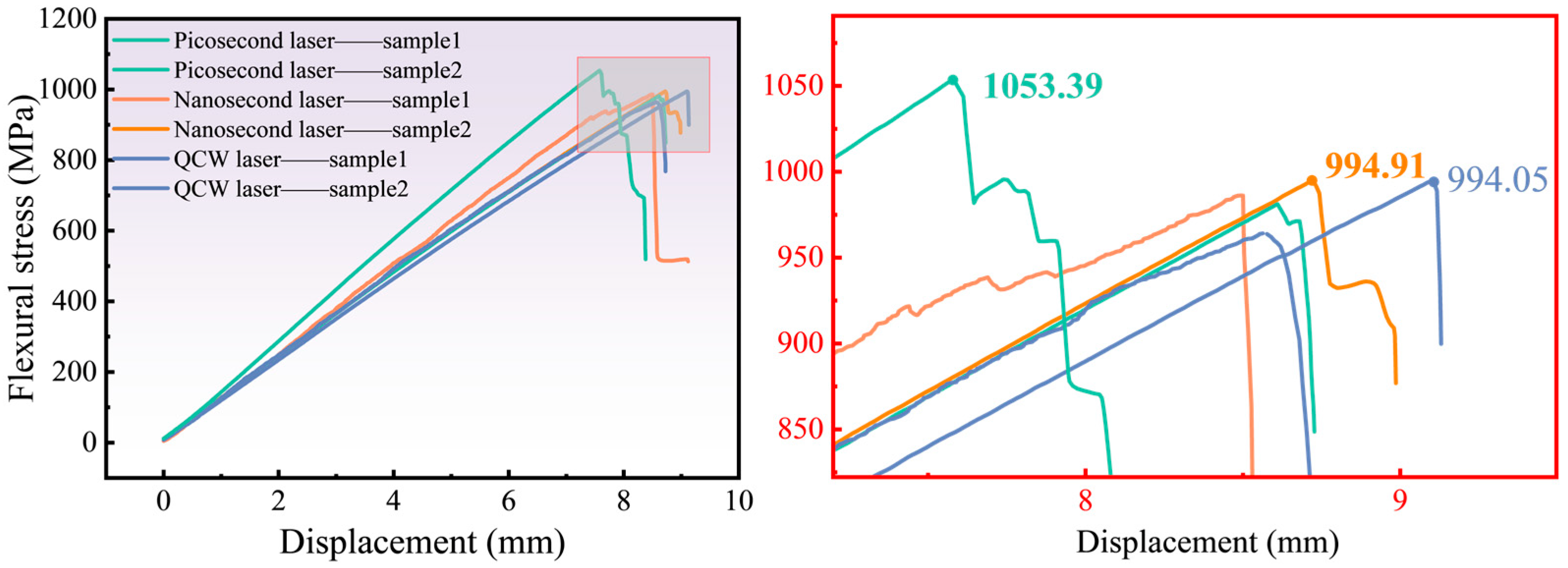 3.5. Influence of Three Distinct Pulse-Width Lasers on Mechanical Properties