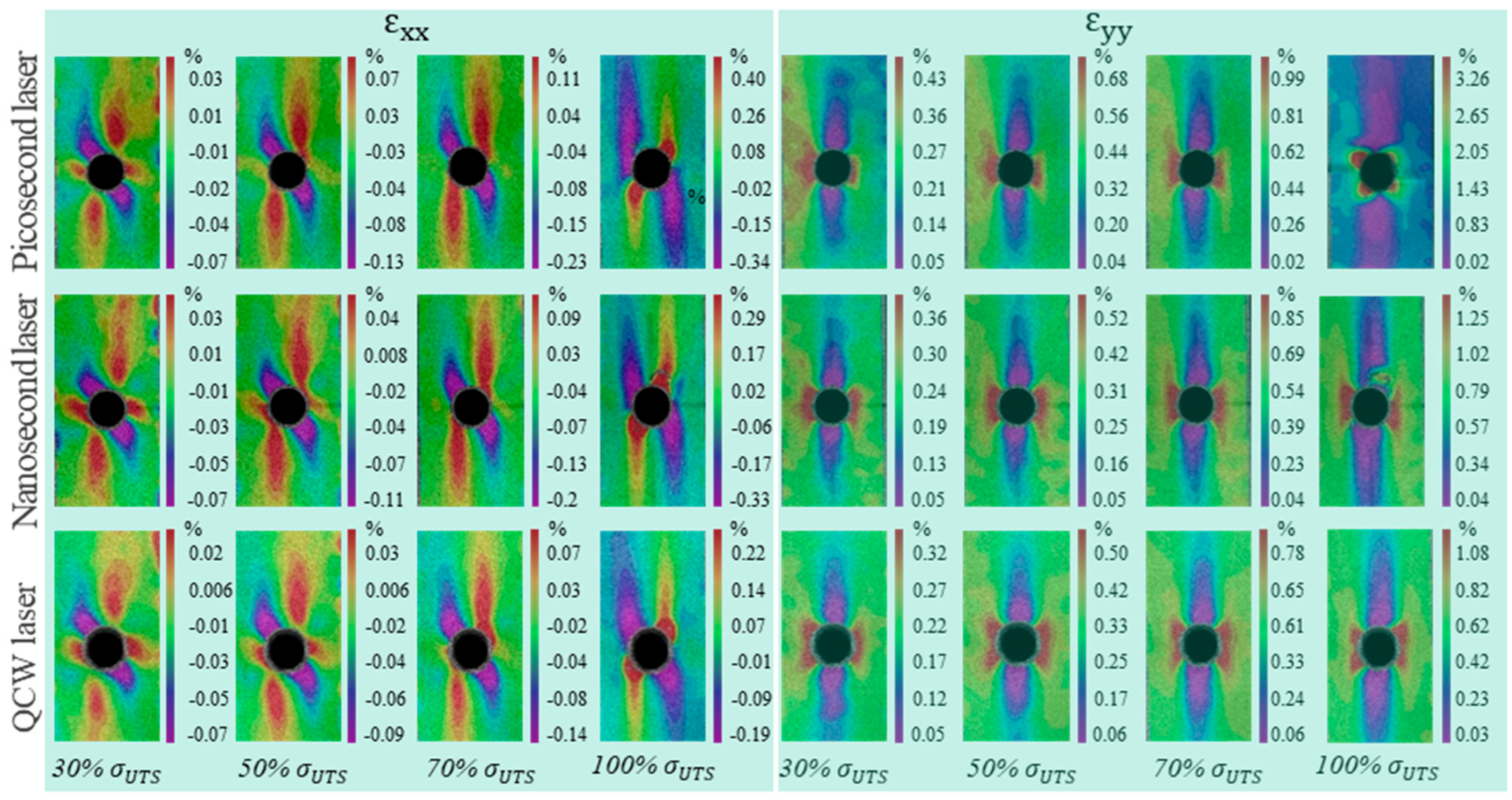 - Li, M.; Gan, G.; Zhang, Y.; Yang, X. Thermal damage of CFRP laminate in fiber laser cutting process and its impact on the mechanical behavior and strain distribution. Arch. Civ. Mech. Eng. 2019, 19, 1511–1522. [Google Scholar] [CrossRef]