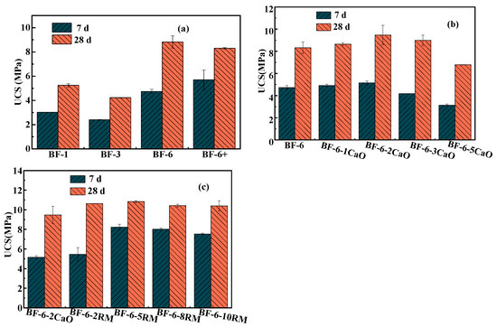 As an alkaline additive, CaO plays an important role in improving the hydration environment. Figure 1b illustrates the influence of varying CaO dosages on the cementitious material. The results indicate that as the CaO content increases, the 7-day and 28-day USC values first rise and then decline, reaching their maxima of 5.155 MPa and 9.47 MPa, respectively, at a CaO dosage of 2%. This behavior is mainly attributed to the reaction of CaO with water to produce Ca(OH)2, which elevates the alkalinity of the system. Under strong alkaline conditions, the aluminosilicate glass phases in fly ash and coal gangue dissolve, breaking some Si-O and Al-O bonds. The released Si and Al then react with Na+ and OH− to form Si- and Al-based oligomers. These oligomers subsequently transform into zeolite-like aluminosilicates and eventually dehydrate to form amorphous gel phases [16]. With further addition of CaO, the compressive strength declines slightly, likely due to excess Ca2+ reacting to form Ca(OH)2 rather than participating in hydration reactions to produce CSH gel and other hydration products. This prevents the cementitious matrix from restricting the volume expansion of Ca(OH)2 crystals, leading to initial microstructural damage and ultimately lower macroscopic strength [27]. Consequently, the mixture containing 2% CaO was selected for comparative studies with red-mud-based alkali-activated binders.