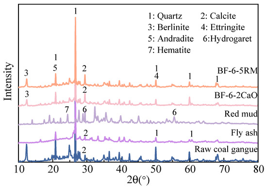 To further investigate the role of RM as an alternative alkali activator, the microstructure of samples cured for 28 days was analyzed using SEM, as illustrated in Figure 3. The results revealed that raw coal gangue particles were dispersed with a rough surface, whereas the backfilling samples of BF-6-2CaO and BF-6-5RM developed a relatively dense microstructure after curing. Notably, a weak interfacial transition zone (ITZ) between aggregates and the cement paste was observed in the BF-6-2CaO sample (Figure 3b), which typically serves as a preferential path for crack propagation under mechanical loading. In contrast, the BF-6-5RM sample exhibited superior bonding with aggregates, showing no distinct ITZ, thereby providing a microstructural explanation for its measured 28-day compressive strength being 14.4% higher than that of BF-6-2CaO.