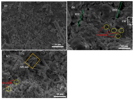 Morphologically, the BF-6-2CaO sample was filled with abundant flocculent and fibrous C-S-H or C-A-S-H gels, along with exposed hexagonal plate-like portlandite (CH) crystals. The presence of CH suggests that the sample retained potential for further geopolymerization reactions [30], yet its crystalline morphology contributes less to strength development compared to amorphous gel phases. In the BF-6-5RM sample (Figure 3c), the microstructure appeared more compact, with well-developed cylindrical ettringite (AFt) networks and no exposed CH crystals. This indicates that under the high-alkali environment facilitated by RM, CaO from coal gangue and fly ash dissolved effectively, reacting with liberated SiO2 and Al2O3 to form additional C-S-H or C-A-S-H gels during geopolymerization [31]. These findings align with the mechanical strength development trends observed in the different filler samples. These findings align with the mechanical strength development trends observed in the different filler samples, establishing a direct structure-property relationship where the compact, homogeneous microstructure with eliminated ITZ and well-developed gel networks in BF-6-5RM quantitatively explains its superior mechanical performance.