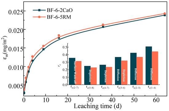 Figure 5 shows the cumulative release of As from BF-6-2CaO and BF-6-5RM, as a function of leaching time. The overall leaching trend was similar for both materials. The cumulative As release increased rapidly during the initial 9 d, followed by a more gradual increase until approximately 36 d, after which the release rate significantly decreased, approaching a near-equilibrium state. Notably, the cumulative As release from BF-6-5RM was marginally higher than that from BF-6-2CaO throughout the leaching period, suggesting a slight influence of the material composition on the As immobilization capacity.