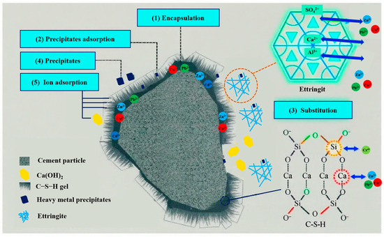 In this study, red mud (RM), coal gangue, fly ash, and cement were used as raw materials. So, the immobilization mechanisms of heavy metals in coal gangue-based cementitious materials can be understood and interpreted based on the typical solidification principles observed in cement-based materials. As shown in Figure 6, the immobilization of heavy metals in cementitious materials is a complex physicochemical process that reduces their mobility through mechanisms including physical encapsulation, chemical reactions, adsorption, and ion exchange [1,13,44,45].