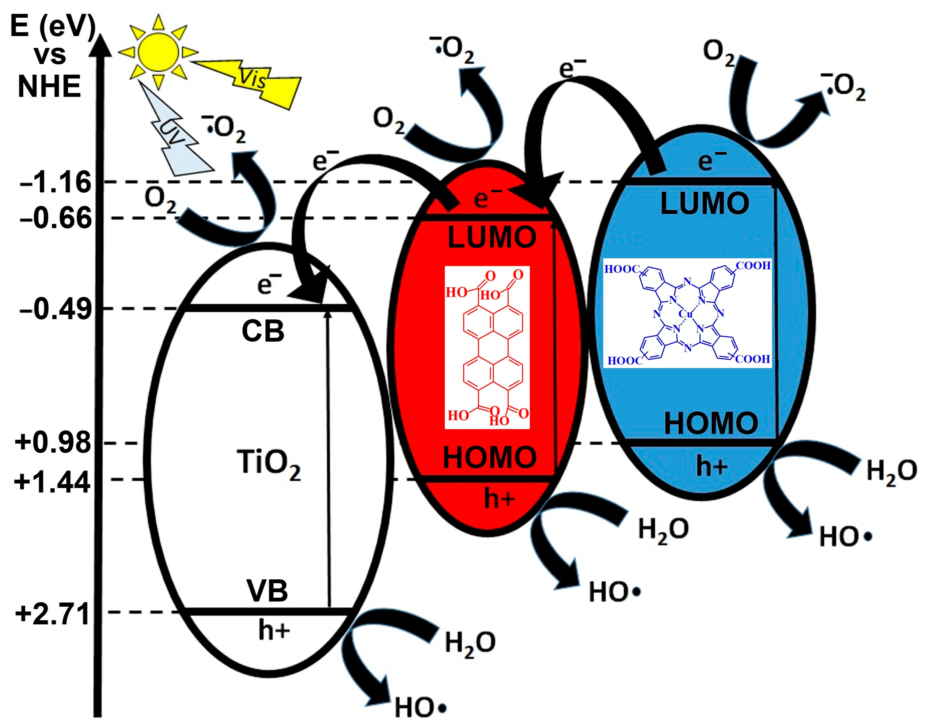 26]. When exposed to visible light, CuPcTc absorbs photons and undergoes excitation from its ground state to an excited singlet or triplet state. These excited electrons are subsequently injected into the conduction band of TiO