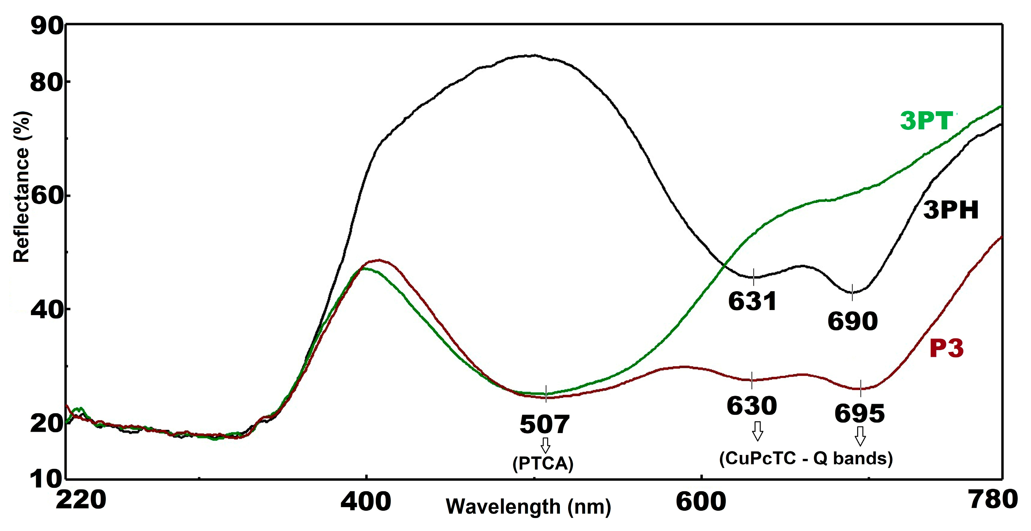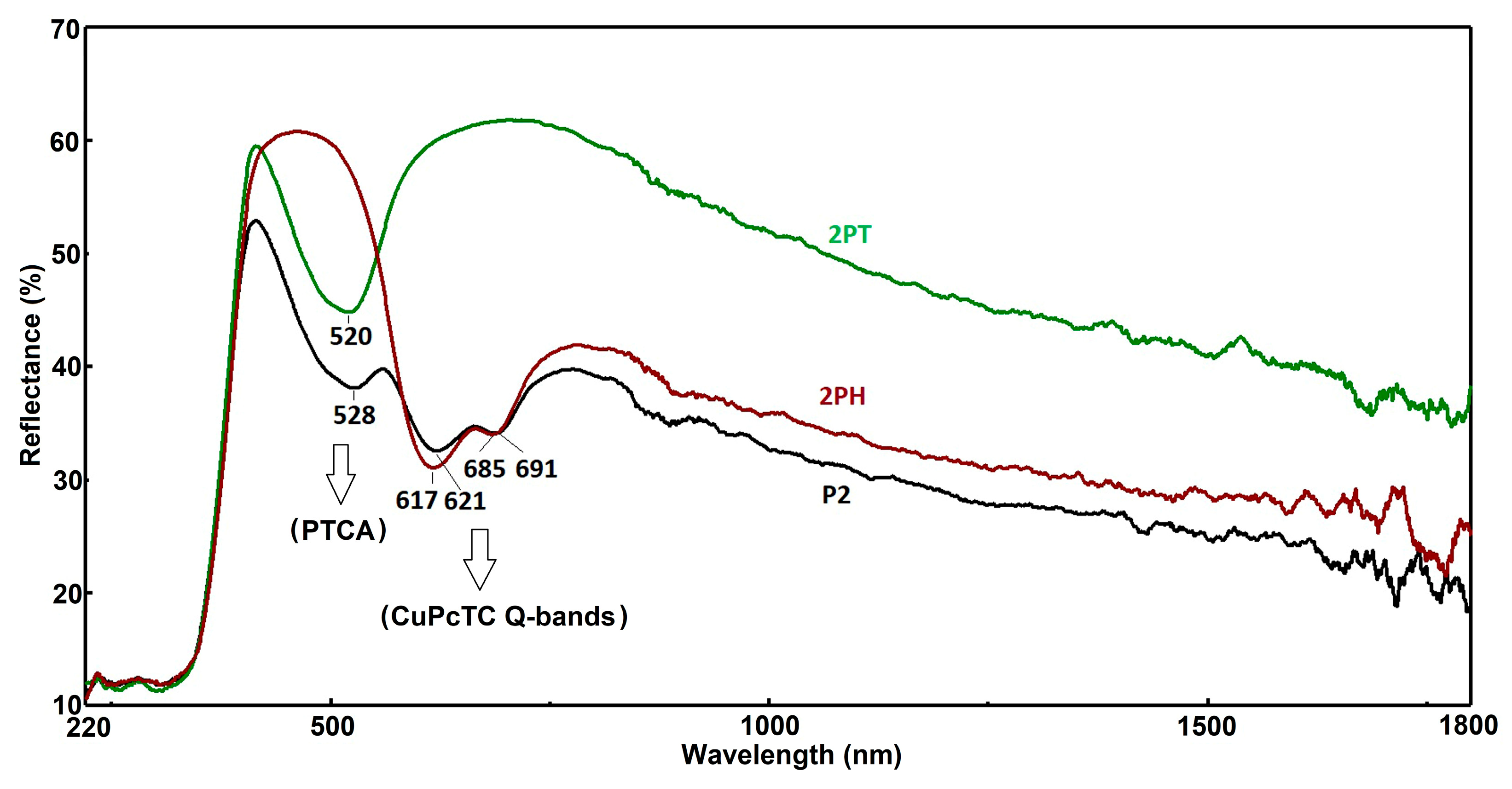 Notable features include the strong reflectance peaks near 520 nm for 2PT and 528 nm for P2, as well as at 528 nm and 520 nm for 2PH, which may indicate slight shifts in optical band gap absorption edges due to compositional or structural variations. Similarly, the peaks and shoulders at 617–621 nm and 685–691 nm suggest the presence of specific chromophoric species or transitions that are retained in all samples but with varying intensities. These differences could be due to doping, surface functionalization, or post-treatment processes affecting the electronic states and scattering properties.
