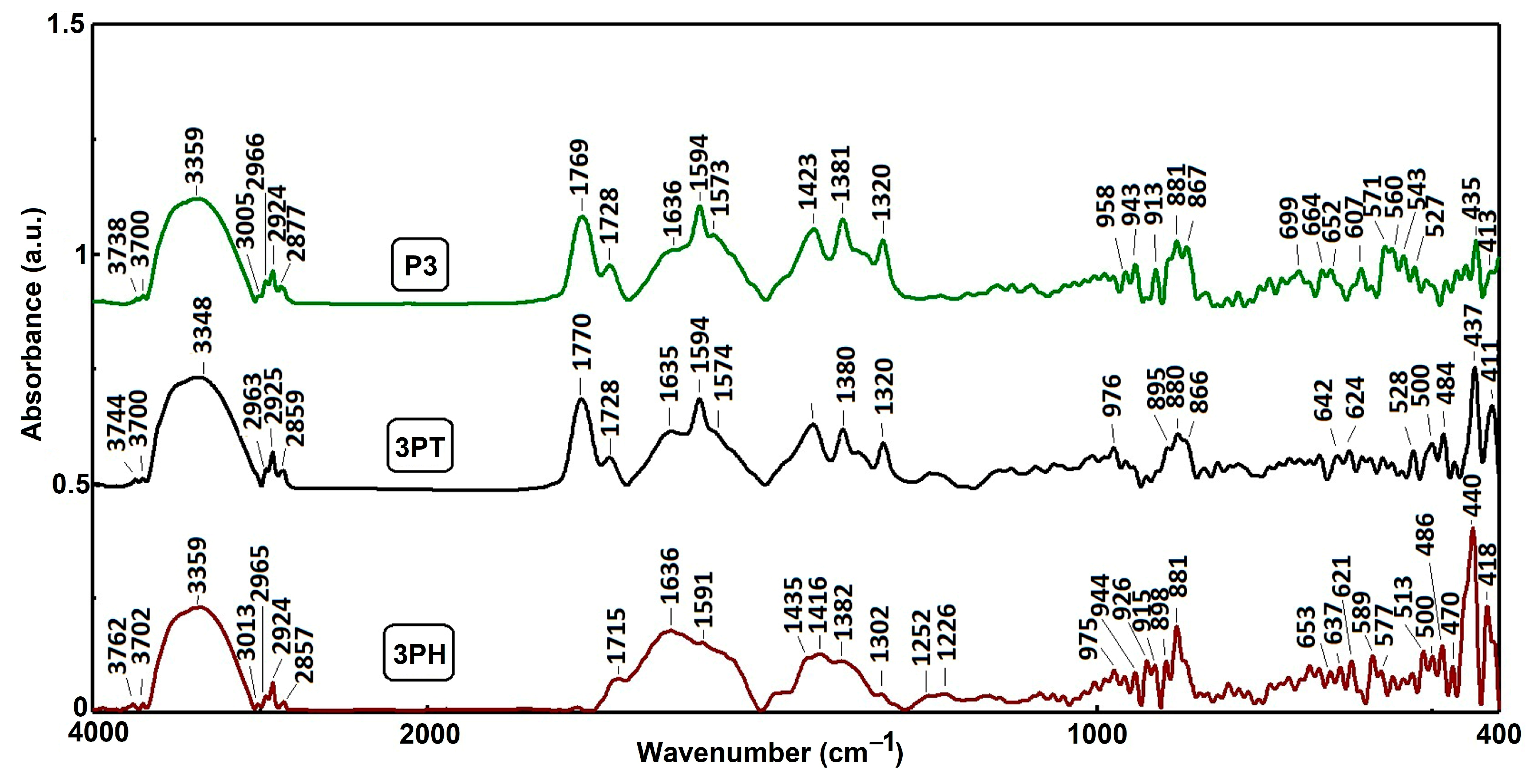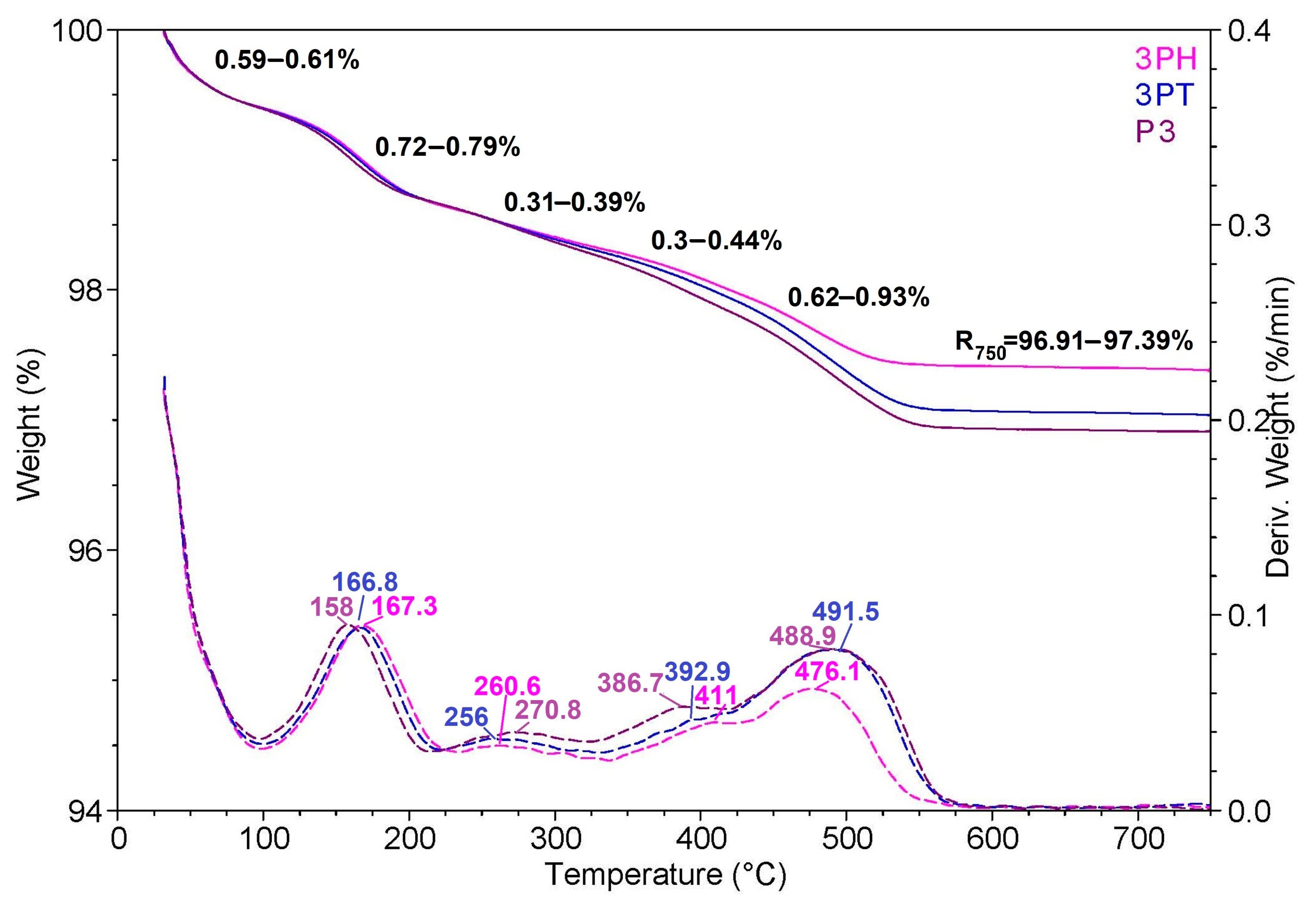 Although the overall thermal stability trend is similar for 3PH, 3PT, and P3, subtle differences are visible: 3PH retains slightly more weight at higher temperatures, suggesting marginally better thermal resistance, while P3 shows a slightly higher decomposition rate during the main degradation step. These variations may be linked to differences in composition, surface modification, or structural packing.