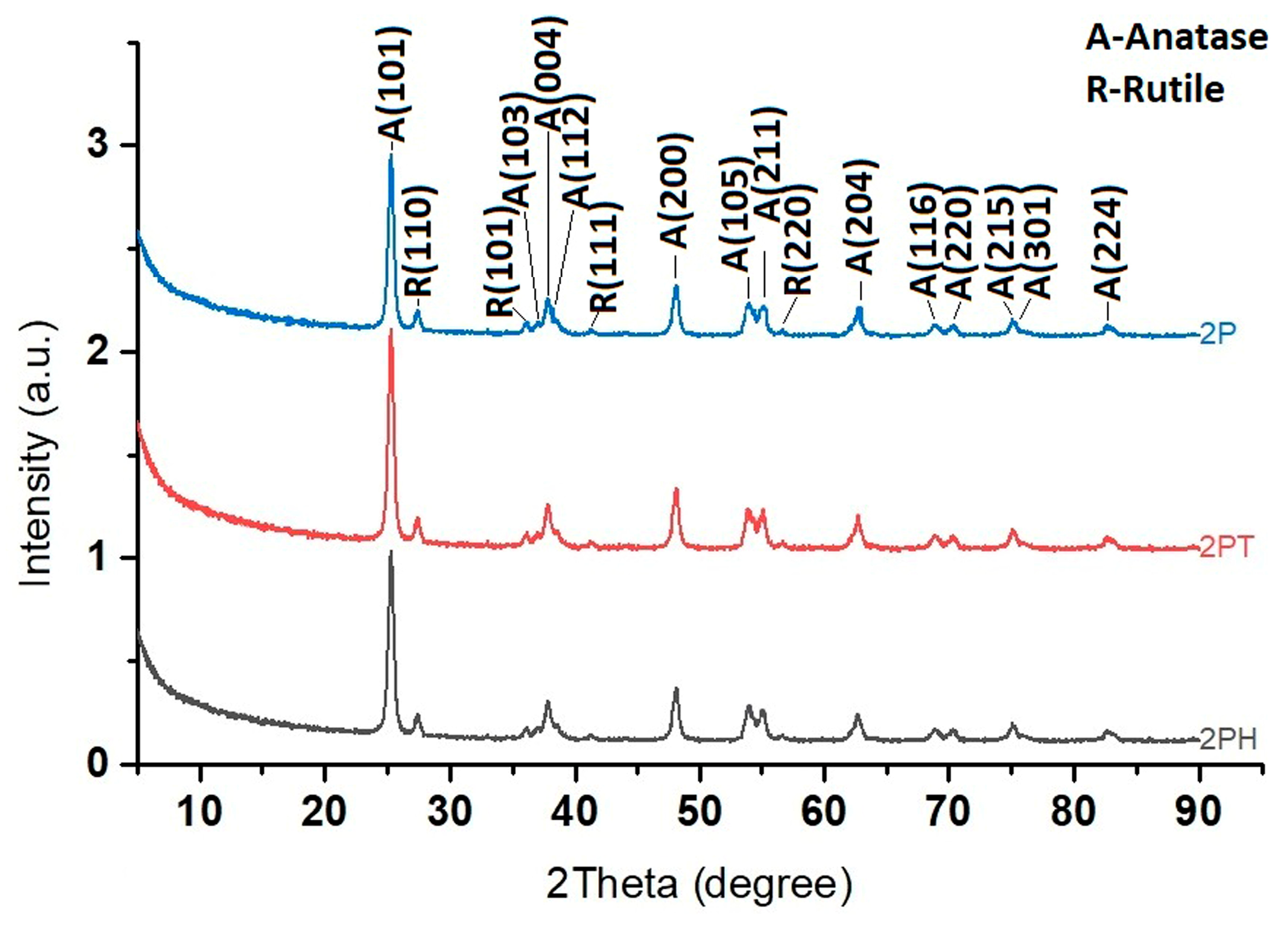 Overall, the reflectance spectra reveal that surface modification or compositional changes between P2, 2PH, and 2PT have a significant influence on light–matter interaction. The red shift or blue shift of characteristic peaks, combined with differences in baseline reflectance, points to alterations in electronic structure and scattering mechanisms. Such differences could be strategically exploited depending on the desired application—whether it is maximizing light absorption for energy conversion or optimizing reflectance for thermal management.