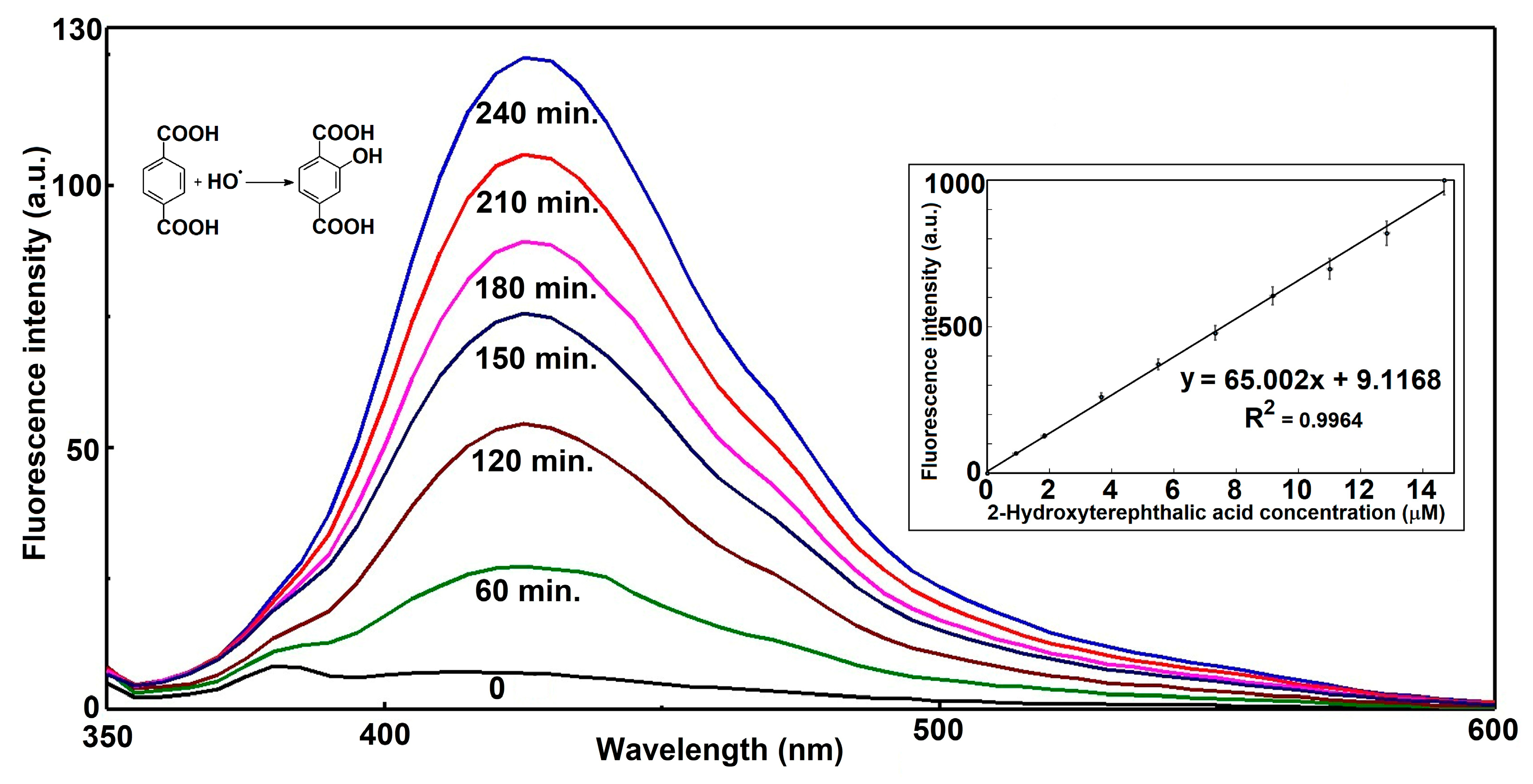 The inset plot further supports the linearity between fluorescence intensity and molar concentration of HTPA in a relatively large range. Importantly, the •OH generation rate is sustained throughout the 4 h measurement period, without signs of depletion of reactants or catalyst deactivation. This observation implies a stable and efficient radical generation process, likely under constant environmental and experimental parameters.