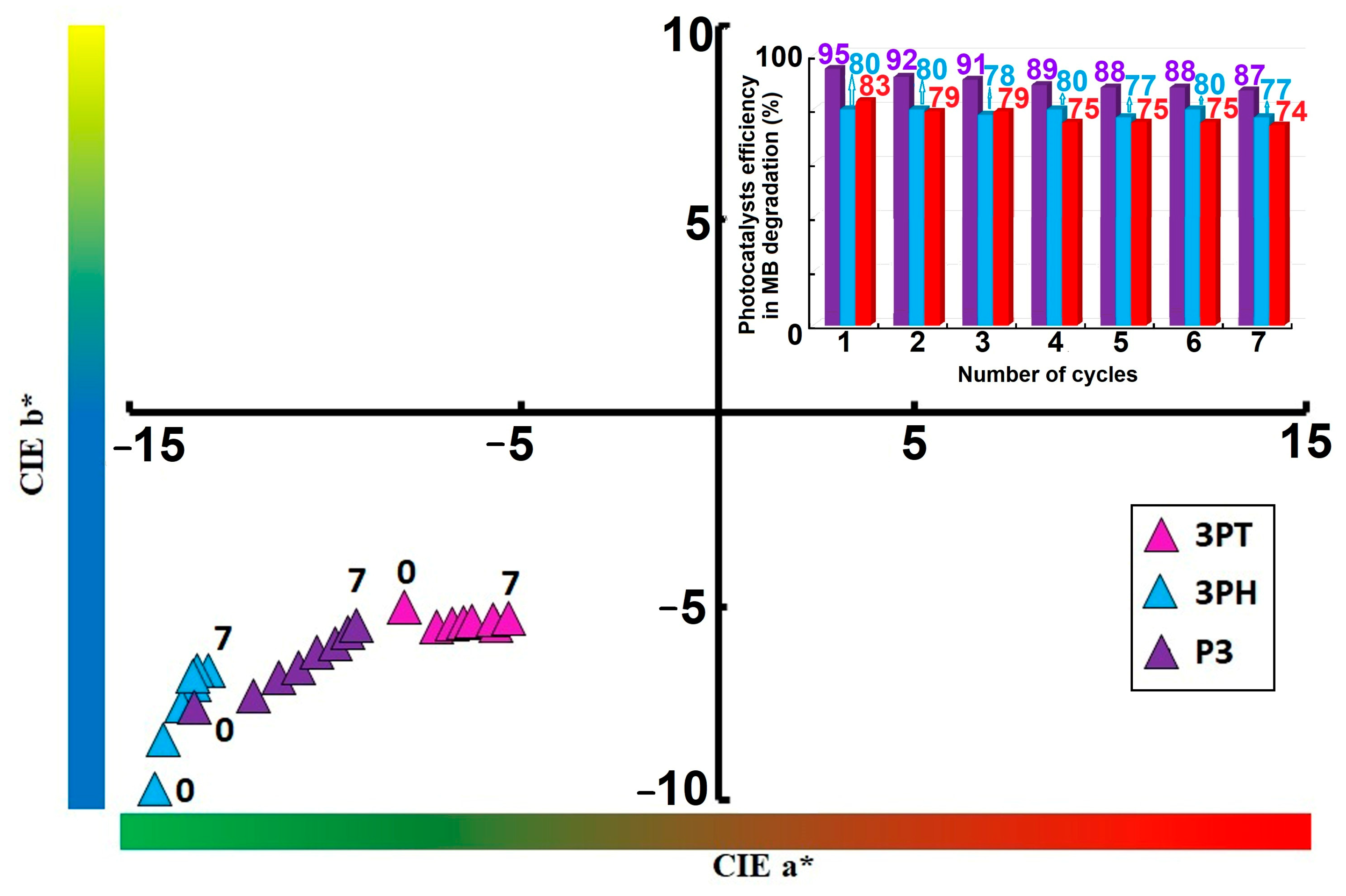 3PT displays the largest positive shift in both a* and b* coordinates, indicating a more marked color change. P3 experiences an intermediate shift, showcasing its moderate but noticeable alteration over seven cycles. 3PH exhibits the smallest migration, implying better color stability across photocatalytic cycles. Values shifting toward positive a* imply the coatings develop more reddish tones with repeated photocatalysis—potentially due to accumulation of intermediate species or partial surface modifications. Movement toward positive b indicates progression toward warmer, yellowish hues. This may reflect photogenerated compounds or subtle compositional changes influencing how the surface scatters or absorbs visible light.