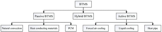 BTMS are engineered to regulate pack temperatures within the ideal operational range, ensuring optimal electrochemical performance and longevity [,,]. BTMS comprise three core subsystems: thermal control algorithms, heat transfer media, and temperature monitoring networks. According to different methods of implementing thermal management, BTMS can be divided into two basic types, namely active and passive BTMS. Passive BTMS rely on natural convection and conductive heat-transfer principles, dissipating thermal energy to the ambient environment through optimized battery pack geometry and thermal interface materials. Though this approach minimizes system complexity and power consumption, its limited heat dissipation capacity proves inadequate for high-power applications with stringent thermal requirements. Active BTMS employ forced convection mechanisms to extract battery-generated heat actively. Due to the difficulty of achieving ideal cooling effects with a single thermal management method, hybrid BTMS, combining active and passive thermal management methods, have been proposed. The classification of BTMS is shown in Figure 1. In the figure, PCM refers to the phase change materials.