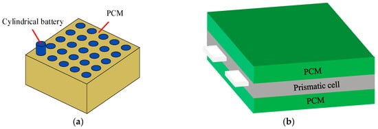 Phase change materials (PCM) are widely used in building energy conservation, waste heat recovery [], photothermal conversion and storage [], battery thermal management [,], and other fields because they maintain a constant temperature during the phase change process. When the temperature of the battery module rises, the phase change material absorbs heat in the form of sensible heat, and its temperature rises. Then, the PCM subsequently commences melting, persistently absorbing heat in the form of latent heat, thereby dissipating a considerable amount of thermal energy from the module []. For the application of PCM in battery cooling systems, different types of batteries typically use PCM with different structures. For cylindrical batteries, PCM are usually used to wrap them; for square batteries, PCM are generally placed between the battery cells, as shown in Figure 2. As a PCM, paraffin has the advantages of high latent heat and low cost, but the thermal conductivity of pure paraffin is low, so the research mainly focuses on composite PCM.