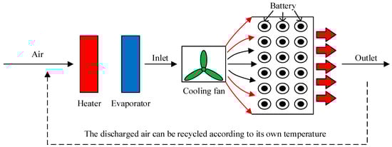 Natural convection represents a passive thermal regulation mechanism that leverages buoyancy-driven fluid motion, offering both simplicity in implementation and cost-effectiveness in operation. It uses the natural flow of air to take away the heat generated by the battery. By optimizing the internal arrangement of the battery pack and the design of the battery shell, the air can flow naturally, so as to achieve the effect of heat dissipation. The advantage of natural convection is that it does not need additional energy consumption and does not rely on external energy. The intrinsic limitations of air, namely its low thermal conductivity and inadequate heat dissipation efficiency, generally restrict its use to low-power battery packs or scenarios with minimal thermal loads []. When discharging at a low current, a small amount of heat generated by the battery is mainly stored in the material as sensitive heat, which is easy to be dissipated into the environment and dissipated by the natural convection of air; during high-current discharge cycles, the predominant heat generation mechanism shifts to latent heat storage within battery materials. While natural convection suffices for basic cooling needs in early-stage thermal management systems, its inherent inefficiency at low ambient temperatures creates critical limitations: (1) a progressive depletion of thermal storage capacity due to incomplete inter-cycle heat dissipation, and (2) a cumulative temperature rise establishing elevated baseline conditions for subsequent discharges. However, the most basic method of heat dissipation in the early stage of the development of BTMS technology is through natural convection [].