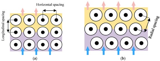 In terms of battery arrangement, Yang et al. [] compared and analyzed the thermal performance of lithium iron phosphate cylindrical batteries with different arrangement methods, and proposed two methods: aligned arrangement and staggered arrangement, as shown in Figure 4. They also analyzed the influence of longitudinal and transverse spacing on the temperature performance of the two arrangement methods. The study found that under a certain cooling air flow rate, the maximum temperature rise in staggered arrangement batteries is proportional to the longitudinal spacing, while the maximum temperature rise in aligned arrangement batteries is inversely proportional to the longitudinal spacing. Regardless of the arrangement method, an increase in transverse spacing will lead to an increase in battery temperature. Du et al. [] discussed the air cooling and heat dissipation effects of battery packs under four different battery arrangements, including a square arrangement, a staggered arrangement, and two trapezoidal arrangements. The study found that the best air-cooled effect was achieved when the square arrangement was used and the air inlet was placed at the top of the battery pack. Peng et al. [] conducted a comparative study on cylindrical battery pack air cooling systems, evaluating different battery arrangement configurations, along with various inlet/outlet positions and quantities in the cooling system, and the results indicate that a layout with a smaller aspect ratio is more beneficial for enhancing cooling performance, while a rational arrangement of the inlet/outlet in the cooling system can effectively mitigate battery heating. Similarly, Kang et al. [] conducted research on a module composed of 16 battery cells, arranging them into “4 × 4” squares and “2 × 8” rectangles. Research results show that the internal temperature distribution is directly affected by the arrangement of the batteries.