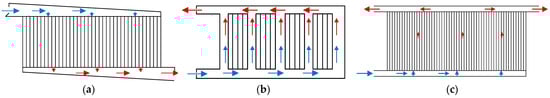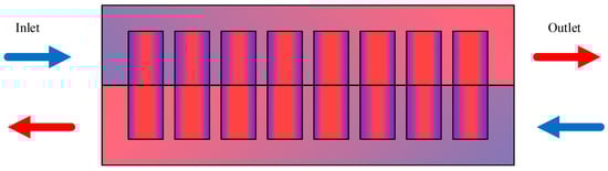 Air flow can be divided into Unidirectional Air Flow (UDAF) and Reverse Layered Air Flow (RLAF) according to the flow path, as shown in Figure 6. Na et al. [] conducted research on two air flow configuration methods for cylindrical battery modules, and the results showed that compared with UDAF, the RLAF method significantly reduced the temperature difference between batteries and increased the temperature uniformity of battery cells in the battery module. Similarly, R. Mahamud et al. [] used a reciprocating air flow path in a study to improve the temperature uniformity of lithium-ion batteries for electric vehicles. A numerical simulation showed that compared to unidirectional flow, the reciprocating air flow reduced the battery temperature difference and maximum temperature by approximately 4 °C and 1.5 °C, respectively. In addition, scholars have conducted a structural optimization design on factors such as the shape and position of the flow guide plate inside the battery pack, the number and layout of ventilation openings, and the position of the fan, and designed reasonable control strategies to optimize the cooling effect. E et al. [] studied the effect of the air flow inlet and outlet on cooling performance, and found that setting ventilation holes on the side of the battery box can achieve a better cooling effect. Battery systems with air-cooled ventilation holes on different sides have a better cooling performance than systems with ventilation holes on only one side. Yu et al. [] studied the influence of two cooling ducts with independent air intakes and fans on the cooling effect of batteries. One fan was used for cooling, and the other fan was used to improve the air circulation inside the battery. Ultimately, the highest temperature of the battery was maintained at 33.1 °C, greatly reducing the accumulation of heat between individual cells in the battery pack. Chen et al. [] developed a control strategy based on cell temperature difference, for parallel air-cooled systems to effectively cool battery packs under different operating conditions. The system adopting this strategy can switch flow types in real time when the temperature difference reaches the preset value, reducing the average temperature difference by more than 67%.