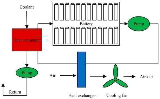 In liquid-cooled thermal management systems, coolant circulation (such as water, ethylene glycol aqueous solution, etc.) extracts thermal energy from the battery pack surface and transfers it to an external heat exchanger (such as a radiator), where heat is ultimately dissipated to the ambient environment. The basic working process is as follows: the coolant is pumped to the cooling channel inside the battery module or near the unit, absorbing the heat generated during battery operation; the heated coolant flows towards the heat exchanger and releases heat to the external environment through air or water cooling. After the temperature of the coolant decreases, it is circulated back into the battery module to achieve a continuous heat dissipation process, as shown in Figure 7. Compared to air-cooled cooling systems, the core of liquid cooling systems lies in their forced convection heat transfer capability, which enables liquid cooling technology to have higher heat dissipation efficiency []. Liquid cooling strategies are categorized into indirect and direct (immersion) cooling. Indirect cooling employs interfaces such as placing flat liquid cooling plates [], honeycomb liquid cooling plates [], and embedded pipes [] positioned against the battery surface. This approach eliminates direct contact between the coolant and the battery, offering structural simplicity at the expense of an extended heat transfer path and a relatively lower cooling efficiency. In contrast, direct cooling immerses the battery in the dielectric coolant, significantly enlarging the contact area for highly efficient and uniform heat dissipation. This method, however, imposes stringent insulation requirements, necessitating the use of non-conductive fluids []. Considering both safety and reliability, indirect cooling is currently the mainstream method for liquid cooling, while direct cooling has not yet been widely applied in EVs.