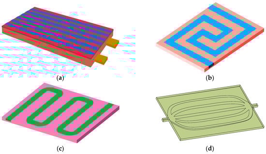 Typical flow channel design in liquid cold plate. (a) Parallel channel; (b) serpentine channel; (c) U-shaped serpentine channel; (d) streamline channel.