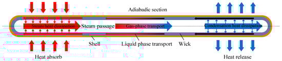 The heat pipe (HP) is a highly efficient heat transfer device that has been widely used in battery cooling systems due to its high thermal conductivity, light weight, and high reliability. Recently, it has attracted increasing attention in the thermal management of electric vehicle batteries. The working principle of HP is based on the liquid evaporation and condensation cycle, as shown in Figure 9. Heat is transferred through phase change, and liquid reflux is achieved through capillary structure or gravity to achieve efficient heat conduction. The specific process includes four stages: (1) The evaporation stage: the evaporator section of the HP interfaces with the heat source. Upon heat generation, the working fluid within the HP absorbs thermal energy and undergoes phase change to vapor. During this evaporation process, the fluid absorbs latent heat, transforming into high-temperature, low-density vapor. (2) The steam transmission stage: the generated steam, due to pressure or density differences, rapidly moves along the tube wall with extremely low flow resistance inside the HP to the condensation section of the heat pipe. (3) The condensation stage: the condenser section interfaces with a heat sink or cooling medium. Upon reaching this section, the vapor releases its latent heat and undergoes phase transition back to liquid state, transferring thermal energy to the external environment. (4) The liquid return stage: the condensate is driven back to the evaporator section through capillary action or gravitational force within the heat pipe’s internal structure, thereby completing the cycle and preparing for subsequent evaporation–condensation processes. Heat pipes represent an innovative thermal management solution, offering unique advantages including passive operation, physical separation of heat sources and sinks, bidirectional thermal transfer capability, and switchable functionality—making them highly promising for next-generation battery cooling applications [].