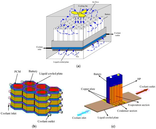 With the increasing demand of the market for a range of EVs and fast charging of high-power battery packs, the requirements for thermal management systems of power batteries are also becoming higher and higher. Numerous studies have shown that a single cooling method has certain limitations [] and it is difficult to achieve satisfactory results. Therefore, hybrid BTMS combining two or more cooling methods have emerged. Due to the superior heat dissipation performance of liquid cooling systems, hybrid heat dissipation methods based on liquid cooling stand out among many hybrid heat dissipation systems, mainly including liquid cooling/air cooling, liquid cooling/PCM, and liquid cooling/heat pipe, as shown in Figure 10.