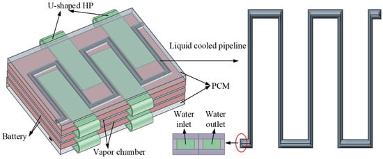 To address the thermal management challenges of batteries under extreme operating conditions, researchers have developed integrated cooling systems combining liquid cooling, PCM, and heat pipes, as illustrated in Figure 11. Zhang et al. [] developed and optimized an integrated thermal management system incorporating PCM, liquid-cooled plates, and heat pipes. Their analysis revealed that several parameters critically influence the battery’s thermal performance, including PCM thermal conductivity, PCM layer thickness, heat pipe length, and coolant inlet velocity. In addition, Li et al. [] proposed an innovative battery thermal management system, combining thermoelectric generation (TEG) with forced convection (F-C). Research results showed that the coupled TEG-F-C system exhibited excellent temperature regulation capability under high-rate discharge conditions. This system can not only decrease the temperature of the battery module promptly but also reduce energy consumption.