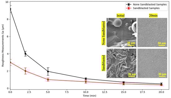 As indicated by the results of the study, following a 20-min treatment period, both sample types exhibited uniform and smooth textures. Furthermore, cross-sectional analysis revealed that both types of samples experienced a total material removal of approximately 300 µm from the surface (Figure 1c), indicating a substantial yet controlled polishing depth. The presence of broader error bars at early stages, particularly in non-blasted samples, suggests a higher initial surface heterogeneity.